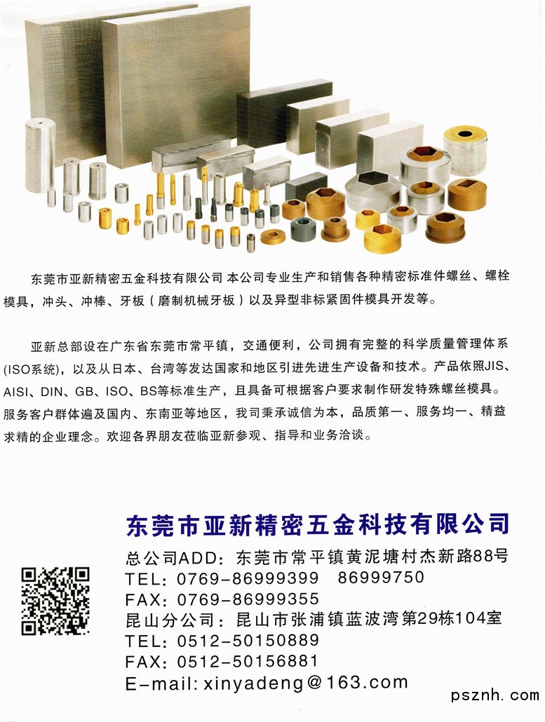 東莞市亞新精密五金科技有限公司是專業(yè)生產(chǎn)、銷售十字沖模,高強度機絲牙板及各類螺絲模具的廠家.能滿足JIS,ANSI,BS,GB DIN之標準.十字沖頭用M42高速鋼及牙板用DC53材料.工廠全線引進進口設備精工制造.并從日本,臺灣高薪聘請一批螺絲模具界高級工程師作技術顧問及現(xiàn)場指導.具有成熟之生產(chǎn)工藝,先進的加工技術,完備之檢測手段,擁有雄厚之開發(fā)'能力和專業(yè)的服務隊伍.經(jīng)過二年的模索我司終于掌握了TD表面處理之技術工藝在十字精沖上的應用,為螺絲制造業(yè)提供高質(zhì)量,高壽命之模具和高素質(zhì)之服務.