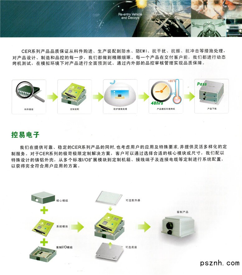 控易電子堅持以技術(shù)創(chuàng)新為基礎(chǔ),以客戶服務(wù)為導(dǎo)向,融合國內(nèi)軍工研究所的開發(fā)實力(中電51所合作單位),開發(fā)了基于PC104的CER系列軍用全加固計算機平臺,該計算機可以實現(xiàn)IP68的靜態(tài)防水,-40~+85℃的工作溫度,滿足國軍標(biāo)的沖擊,振動,復(fù)雜電磁環(huán)境等要求,同時具有擴展方便等特性, CER全加固系列還包含同等級的全加固顯示器和全加固鍵盤鼠標(biāo), 是嚴(yán)苛環(huán)境下的計算機首先平臺,該系列產(chǎn)品已經(jīng)獲得相關(guān)國軍標(biāo)的實驗認證.經(jīng)過控易電子全體同仁的共同努力,公司已經(jīng)獲得ISO-9001:2000的質(zhì)量體系認證,為更好的服務(wù)廣大客戶提供更多的保障.