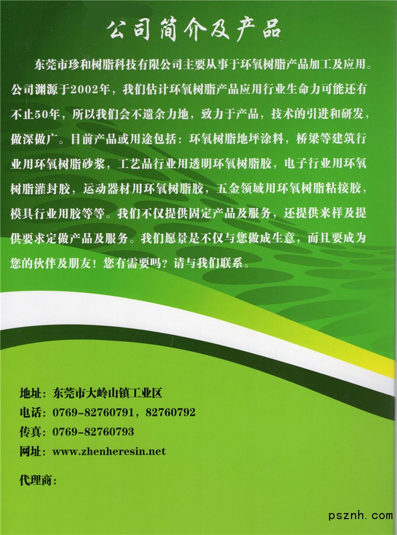 東莞市珍和樹脂科技有限公司,主要從事于環(huán)氧樹脂產(chǎn)品加工及應用。公司淵源于2002年,我們估計環(huán)氧樹脂產(chǎn)品應用行業(yè)生命力可能還有不止50年,所以我們會不遺余力地,致力于產(chǎn)品,技術(shù)的引進和研發(fā),做深做廣。目前產(chǎn)品或用途包括:環(huán)氧樹脂地坪涂料,橋梁等建筑行業(yè)用環(huán)氧樹脂砂漿,工藝品行業(yè)用透明環(huán)氧樹脂膠,電子行業(yè)用環(huán)氧樹脂灌封膠,運動器材用環(huán)氧樹脂膠,五金領(lǐng)域用環(huán)氧樹脂粘接膠,模具行業(yè)用膠等等。我們不僅提供固定產(chǎn)品及服務,還提供來樣及提供要求定做產(chǎn)品及服務。我們愿景是不僅與您做成生意,而且要成為您的伙伴及朋友!您有需要嗎?請與我們聯(lián)系。
