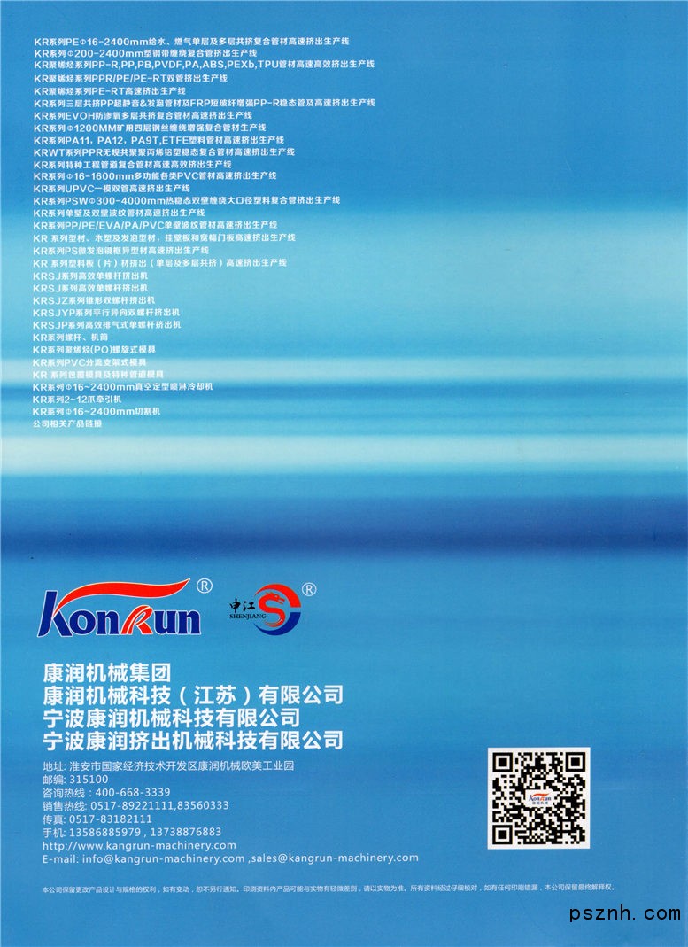 康潤公司的主要產(chǎn)品有:各類塑料管道生產(chǎn)線;各類塑料異型材生產(chǎn)線;各類塑料板材、片材、流涎膜生產(chǎn)線;各種用途的單螺桿、雙螺桿擠出機;各類包裝機械;各類飲料機械。產(chǎn)品遠銷俄羅斯,烏克蘭,日本,土耳其等國家和地區(qū)。
