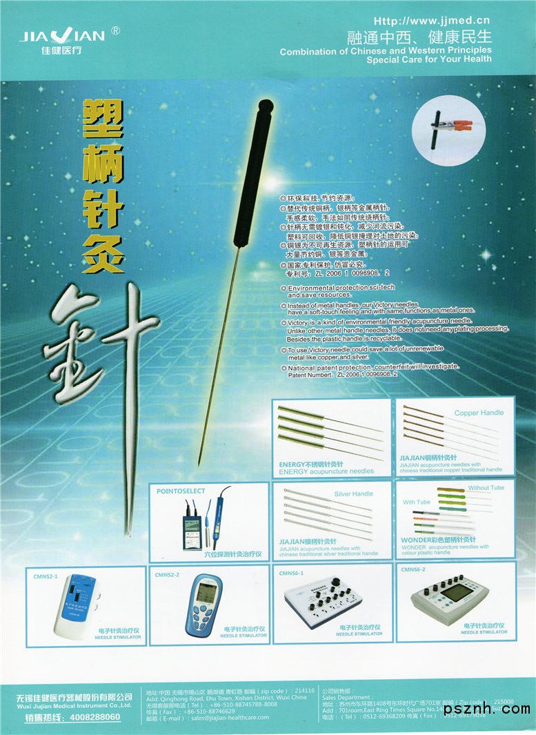 公司地處中國(guó)長(zhǎng)三角地區(qū),位于江蘇省無錫市,占地10000多平方米,擁有廠房建筑面積20000多平方米。公司已通過ISO13485和ISO9001國(guó)際質(zhì)量體系認(rèn)證,并率先在行業(yè)內(nèi)通過了GMP審核。擁有國(guó)家發(fā)明專利,實(shí)用新型專利以及外觀設(shè)計(jì)專利等共計(jì)30多項(xiàng)。公司產(chǎn)品針灸針,電子針灸治療儀,導(dǎo)電塑柄針灸針,穴位探測(cè)治療儀均被國(guó)家中醫(yī)藥管理局列為國(guó)家中醫(yī)推薦產(chǎn)品,尤其是導(dǎo)電塑柄針灸針還被列為國(guó)家中醫(yī)院標(biāo)準(zhǔn)配置目錄產(chǎn)品。公司主要產(chǎn)品針灸針、電子針灸治療儀、電極片等均獲得了歐盟CE認(rèn)證、美國(guó)FDA認(rèn)證以及加拿大CMDCAS認(rèn)證。