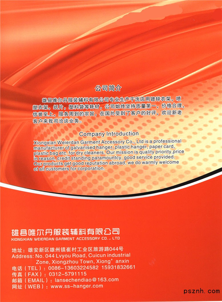 雄縣唯爾丹服裝輔料有限公司,生產(chǎn)、銷售:衣架、吹膜、制袋;銷售:手提袋、防塵袋、拉伸膜帶、無紡布袋、帆布袋、襯衫板、褲板條、肩托、領(lǐng)帶袋、紙袋、罩衣袋(依法須經(jīng)批準(zhǔn)的項目,經(jīng)相關(guān)部門批準(zhǔn)后方可開展經(jīng)營活動