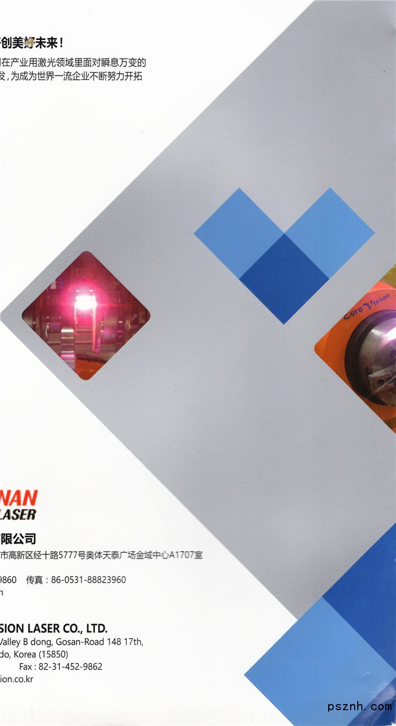 濟(jì)南歐威激光有限公司,是韓國(guó)(株)EUROVISION LASER CO.,LTD在中國(guó)的全資子公司,公司坐落于人杰地靈的山東省濟(jì)南市,公司成立于2016年6月,在汽車(chē)、鋼鐵、電子、半導(dǎo)體、醫(yī)療等整個(gè)產(chǎn)業(yè)領(lǐng)域致力于開(kāi)發(fā)和推廣多種激光應(yīng)用技術(shù)。作為 韓國(guó)(株)EUROVISION LASER的子公司, 公司擁有的核心激光技術(shù)不僅包括基于激光塑料焊接技術(shù)、激光熱處理、激光熔覆(熱噴涂層)及激光軟釬焊(錫焊)等宏觀(guān)科技領(lǐng)域,而且包括半導(dǎo)體、電子、醫(yī)療產(chǎn)業(yè)不可或缺的超精密加工技術(shù)、微加工技術(shù)及納米加工技術(shù)等,其雄厚的技術(shù)力量已頗受世界各界的贊譽(yù)和好評(píng)??偣镜募す馑芰虾附釉O(shè)備在韓國(guó)占有80%以上的市場(chǎng)份額。產(chǎn)品遠(yuǎn)銷(xiāo)歐美等十幾個(gè)國(guó)家。設(shè)備質(zhì)量?jī)?yōu),功能穩(wěn)定, 適合生產(chǎn)線(xiàn)作業(yè),100%韓國(guó)原裝進(jìn)口。韓國(guó)和中國(guó)都屬于東方國(guó)家具有類(lèi)似的思想文化,對(duì)于設(shè)備售后問(wèn)題處理迅速及時(shí)。