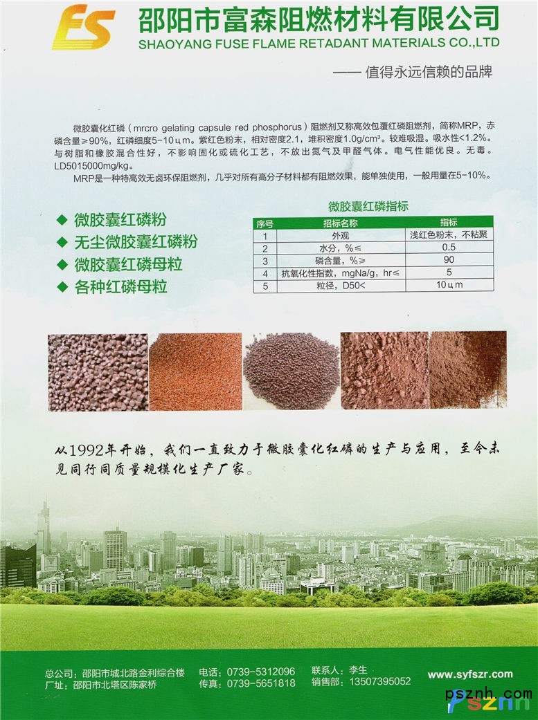 邵陽市富森阻燃材料有限公司誕生于大學校園,壯大于湖南邵陽工業(yè)園區(qū),1991年湘潭大學微膠囊阻燃劑經(jīng)市科委鑒定,1992年工業(yè)化微膠囊阻燃劑優(yōu)選在國內(nèi)市場面世,1994年創(chuàng)辦邵陽市富森阻燃材料有限公司(前身市阻燃材料廠),專業(yè)研究生產(chǎn)紅阻燃劑。目前本公司有二處大型生產(chǎn)基地,能生產(chǎn)阻燃劑、細度能達5um以內(nèi),密度1以上,易加工,性能安全可靠,94年已大規(guī)模應(yīng)用于無鹵電纜料。阻燃母粒系列幾乎能滿足和行需要。二十五年來,我們一直致力于阻燃劑的生產(chǎn)與應(yīng)用。