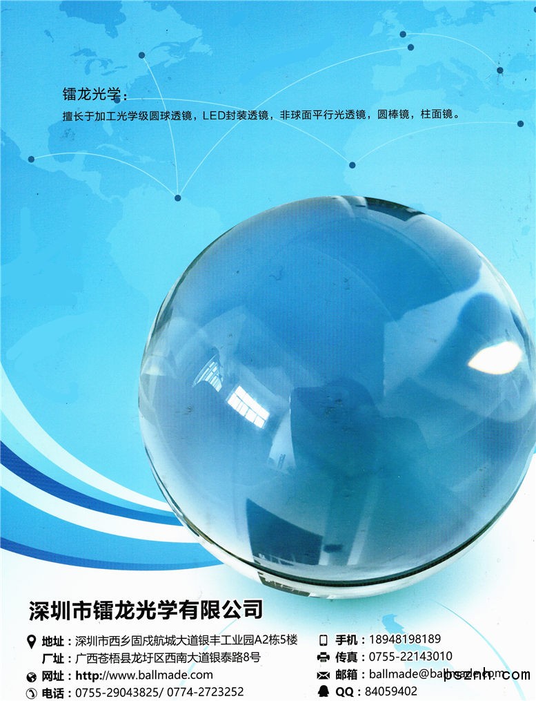 我司擅長生產(chǎn)高精度光學(xué)圓球透鏡,半球透鏡,可以做微米級上的任何光學(xué)材料下的零誤差球,加工直徑范圍可以從0.5mm-50mm。我司很多型號的高精度光學(xué)球、半球透鏡有庫存。1mm,1.5mm,,2mm,2.5mm,3mm,4mm,5mm,6mm,7mm,8mm,10mm,15m,18mm,25mm,38mm的高精度圓球半球等都有庫存。