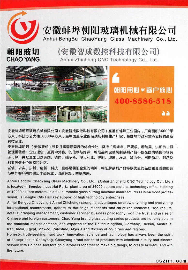 安徽智成數(shù)控科技有限公司(原蚌埠朝陽玻璃機(jī)械有限公司)兼收并蓄國際同行的優(yōu)點(diǎn)長處,堅(jiān)持“高標(biāo)準(zhǔn)、嚴(yán)要求、看結(jié)果、講細(xì)節(jié)、抓管理、重售后”企業(yè)理念,贏得中外客戶的信賴與好評,朝陽品牌玻璃切割系列產(chǎn)品不僅在國內(nèi)銷售市場炙手可熱,并批量出口到英國、德國、俄羅斯、澳大利亞、伊朗、印度、埃及、墨西哥、巴勒斯坦、阿爾及利亞等數(shù)十個(gè)國家和地區(qū)。