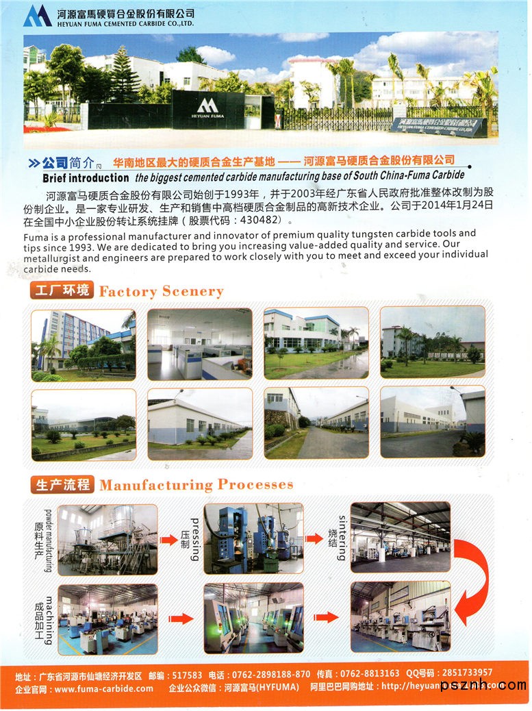 公司位于廣東省河源市仙塘經(jīng)濟(jì)開發(fā)區(qū),屬于國家級高新技術(shù)企業(yè)、廣東省創(chuàng)新型企業(yè)、廣東省戰(zhàn)略性新興產(chǎn)業(yè)骨干企業(yè)廣東省知識產(chǎn)權(quán)優(yōu)勢企業(yè),是國內(nèi)專業(yè)化的超小超薄硬 質(zhì)合金制品及其深加工制品生產(chǎn)廠家,建立有廣東工業(yè)大學(xué)河源富馬硬質(zhì)合金股份有限公司博士后創(chuàng)新實(shí)踐基地、廣東省級企業(yè)技術(shù)中心、廣東省硬質(zhì)合金工程技術(shù)研究開發(fā)中心和廣東省教育部產(chǎn)學(xué)研結(jié)合示范基地"切削難加工金屬材料專用刀具工程研究院"等高標(biāo)準(zhǔn)研發(fā)平臺,通過了ISO9001國際質(zhì)量體系、ISO14001環(huán)境 體系認(rèn)證和廣東省清潔生產(chǎn)審核,"富馬硬質(zhì)合金"圖形商標(biāo)被認(rèn)定為廣東省著名商標(biāo),"富馬硬質(zhì)合金"產(chǎn)品被評為廣東省名牌產(chǎn)品。