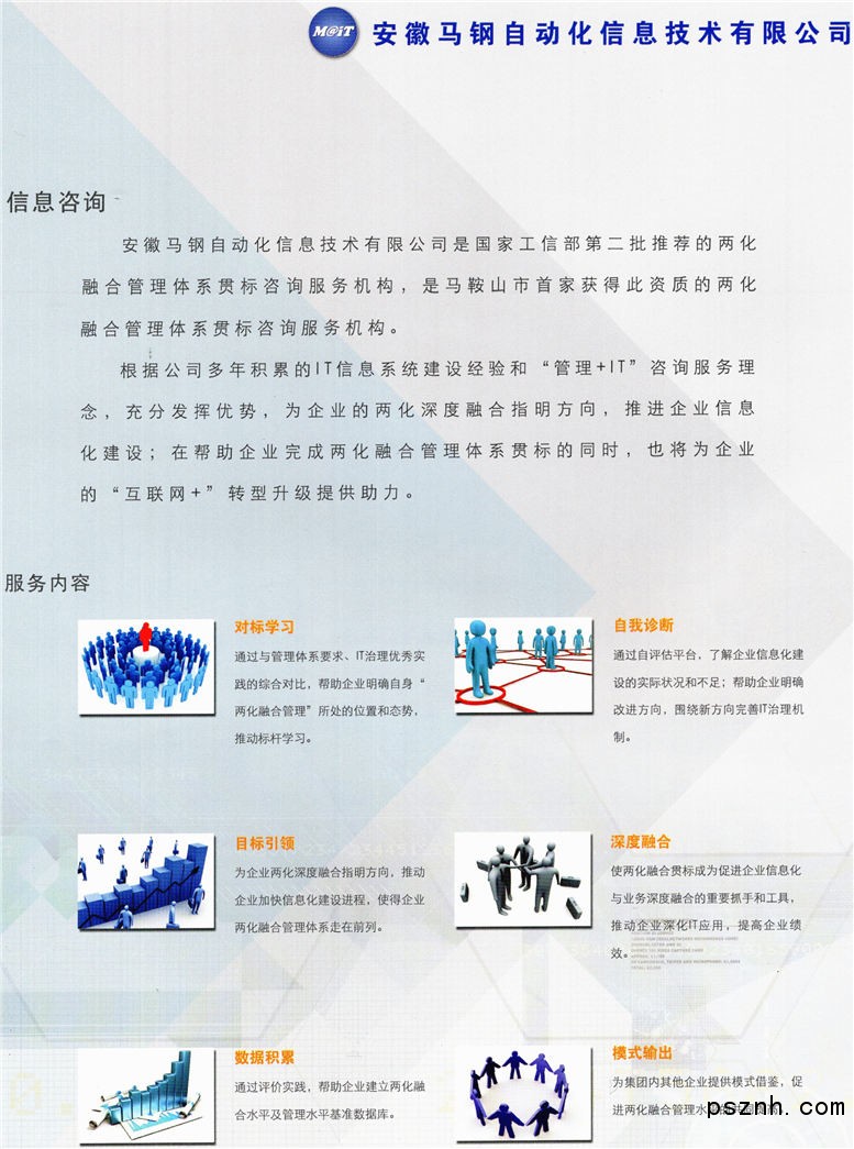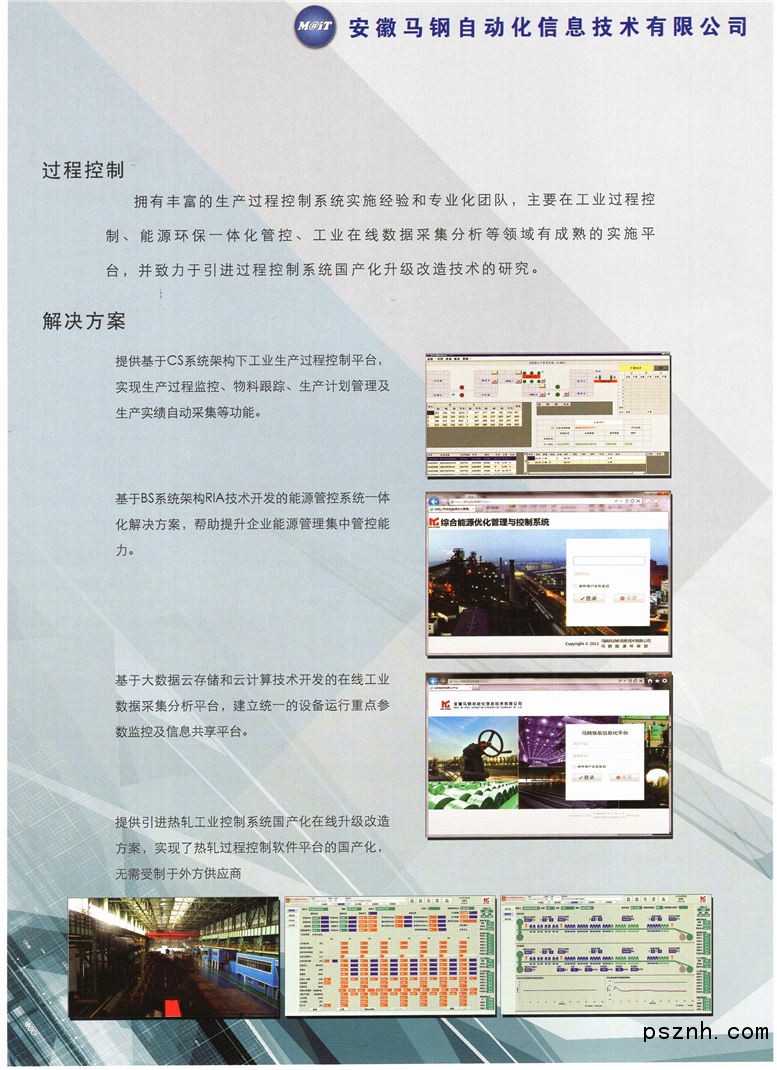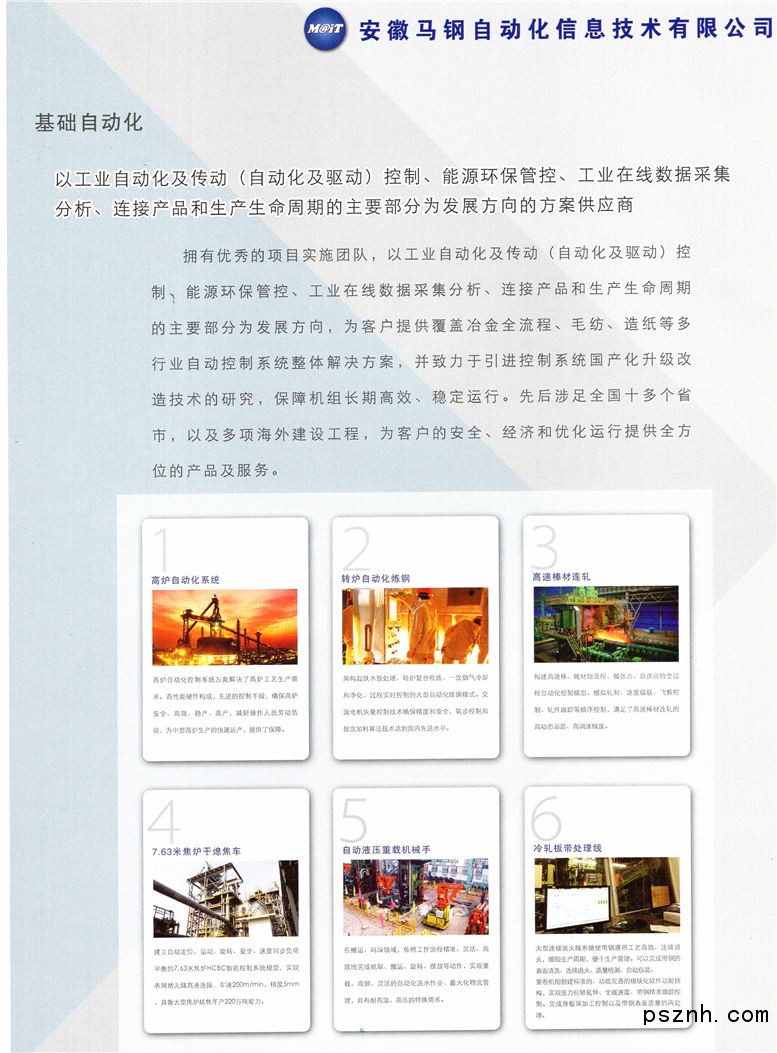 安徽馬鋼自動化信息技術有限公司(簡稱馬鋼AIT)是一家具有雄厚技術力量和豐富施工經驗的高新技術企業(yè)。注冊資本1.1億元?,F有員工976人,其中高級工程師74人,工程師181人。公司主要業(yè)務范圍為冶金自動化系統工程的設計安裝成套調試、計算機網絡工程及應用軟件開發(fā)、企業(yè)信息化建設、網絡通訊工程等。