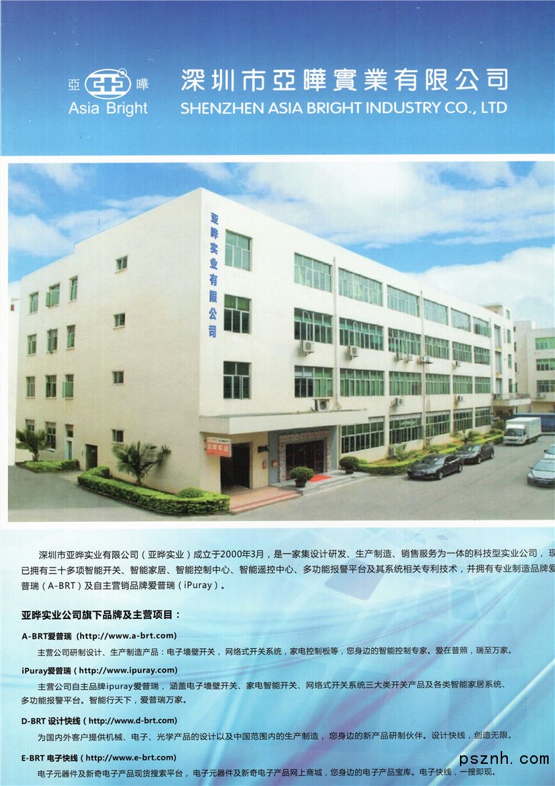 深圳市亞曄實業(yè)有限公司成立于2000年3月,是一家集設(shè)計研發(fā)、生產(chǎn)制造、銷售服務(wù)為一體的國家級高新技術(shù)企業(yè)?,F(xiàn)已擁有五十多項智能控制專利技術(shù),并擁有專業(yè)制造品牌愛普瑞(A-BRT)及自主營銷品牌愛普瑞(iPuray)。公司研發(fā)制造三大類產(chǎn)品,a.控制板類:普通家電控制板、智能家電控制板;b.開關(guān)類:智能家居開關(guān)、智能家電開關(guān);c系統(tǒng)類:智能開關(guān)系統(tǒng)、智能控制系統(tǒng)、多功能報警系統(tǒng)。涵蓋人體感應(yīng)、調(diào)光調(diào)速、定時延時、無線遙控、聲控光控、溫控濕控、WiFi遠(yuǎn)程控制、智能遙控中心、網(wǎng)絡(luò)自動控制等智能家電控制技術(shù)及智能家居控制系統(tǒng),包括LED調(diào)光、空調(diào)自動節(jié)能控制、風(fēng)扇調(diào)速、吊扇/排風(fēng)扇遙控等智能家電應(yīng)用。產(chǎn)品融入智能手機(jī)、物聯(lián)網(wǎng)等智能家居先鋒理念,遠(yuǎn)銷美國、歐洲、澳大利亞、中東等世界各地。