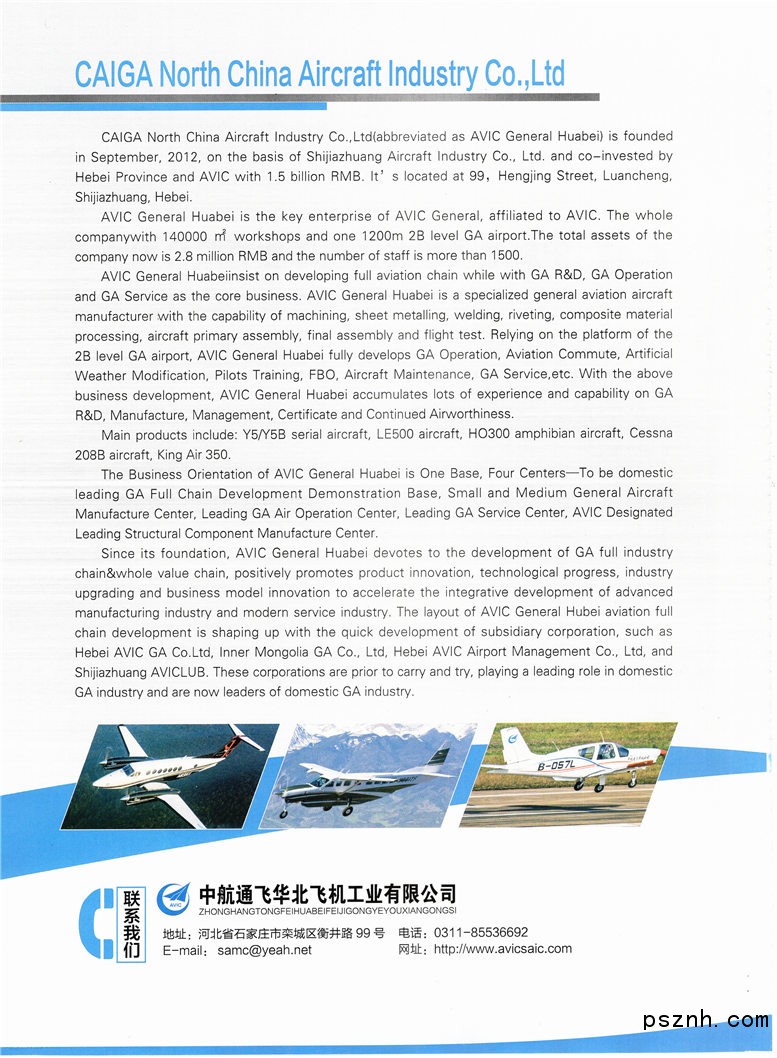 中航通飛華北飛機工業(yè)有限公司(簡稱航空工業(yè)通飛華北公司)是在石家莊飛機工業(yè)有限責(zé)任公司基礎(chǔ)上,由中航通用飛機有限責(zé)任公司、河北航空投資集團有限公司、中國航空科技工業(yè)有限公司共同出資設(shè)立,于2012年9月正式注冊成立。