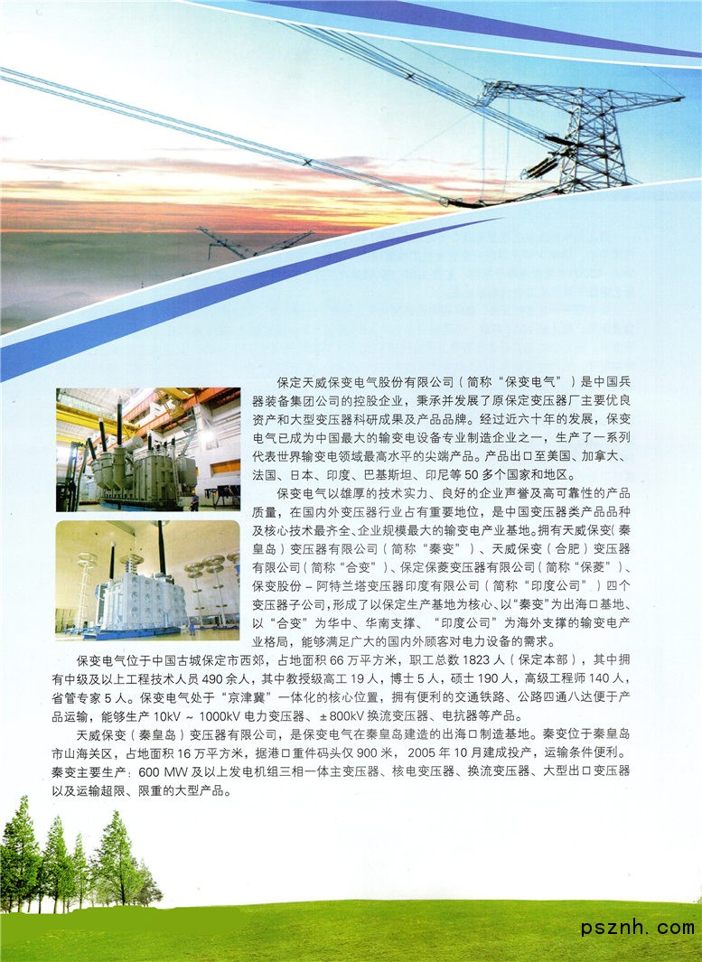 保變電氣位于中國古城保定市西郊,占地面積66萬平方米,職工總數(shù)1823人(保定本部),其中擁有中級及以上工程技術(shù)人員490余人,其中教授級高工19人,博士5人,碩士190人,高級工程師140人,省管專家5人。保變電氣處于“京津冀”一體化的核心位置,擁有便利的交通鐵路、公路四通八達便于產(chǎn)品運輸,能夠生產(chǎn)10kV~1000kV電力變壓器、±800kV換流變壓器、電抗器等產(chǎn)品。