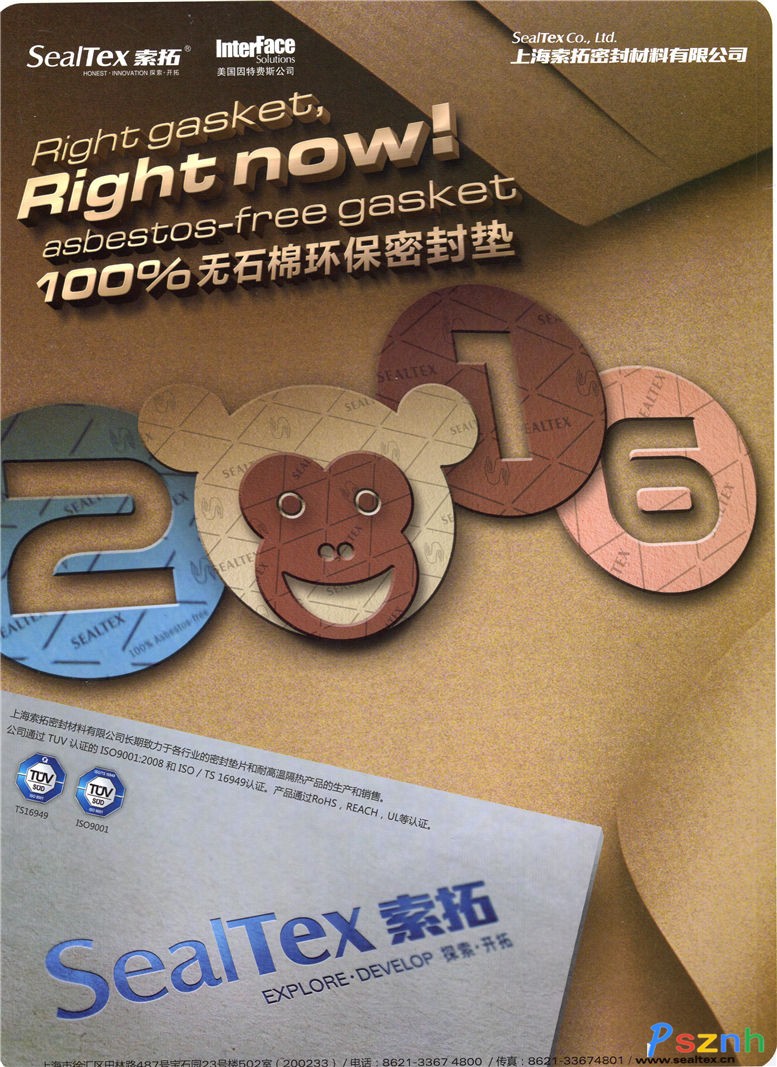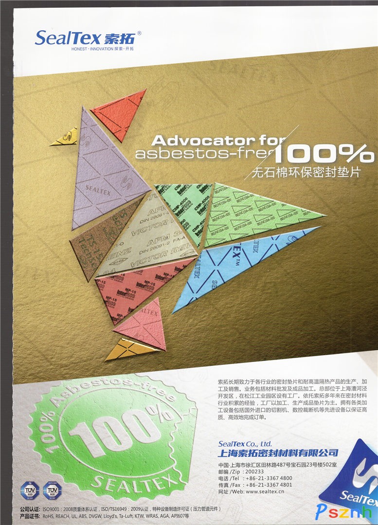 上海索拓密封材料有限公司為Interface Solutions(美國(guó)因特費(fèi)斯墊片公司)、FIBRAS Y ELASTOMEROS,S.A.(西班牙標(biāo)牌密封材料有限公司)的合作伙伴。長(zhǎng)期經(jīng)營(yíng)各類耐高溫、耐高壓、耐酸堿無(wú)石棉環(huán)保墊片,各類高溫絕緣板、電機(jī)、電氣絕緣材料。可應(yīng)用于石油、化工、冶金、汽車配套及售后、造船、電力、電機(jī)等。我們的產(chǎn)品很榮幸為中國(guó)的許多知名用戶所采用,如上汽通用、寶鋼集團(tuán)、揚(yáng)巴石化、南方電力、金光紙業(yè)等。