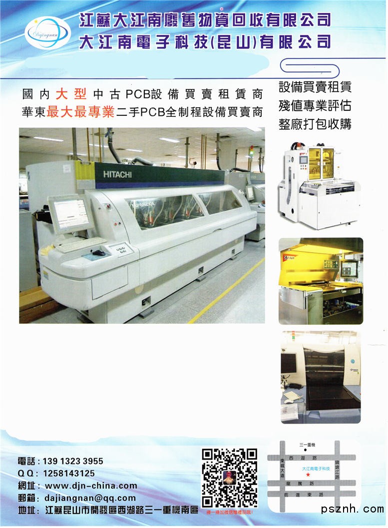 江蘇大江南廢舊物資回收有限公司 江蘇大江南成立于2006年是一家集團公司,公司坐落于經(jīng)濟發(fā)達的長三角,中國電子工業(yè)制造領跑城市昆山。這里有中國印刷電路板工業(yè)園區(qū),電路板行業(yè)巨頭富士康,南亞,滬士,建滔等企業(yè)在昆山都設有分廠。大江南是一家專業(yè)從事電鍍設備,PCB設備,半導體設備買賣,租賃,設備整改修護,耗材銷售為一體的大型公司。公司現(xiàn)有兩個倉庫,面積達到5000平米,員工36人,專業(yè)維修和工程師16人。設備庫存超億元人名幣,目前是華東地區(qū)最大二手PCB干濕制成設備經(jīng)營商。大江南業(yè)務覆蓋華東,華南,臺灣,香港及東南亞地區(qū),大江南始終秉承團結互助,精益求精,互利共贏為己任。愿與社會各界人士攜手共謀發(fā)展大計。
