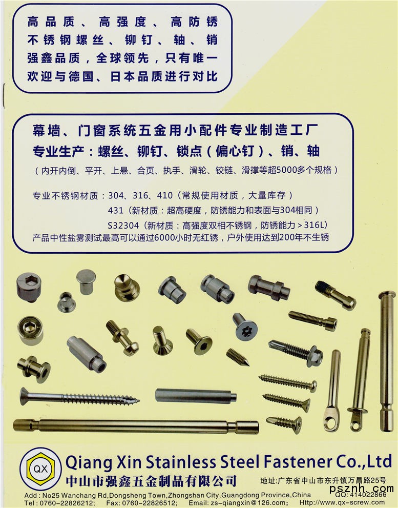 中山市強鑫五金制品有限公司主要生產(chǎn)“高品質(zhì)、高強度、高精度、高防銹能力”的不銹鋼螺絲&緊固件、特殊螺絲、汽車緊固件、軸類零件及鋁螺絲、鋁鉚釘、鋁+不銹鋼蓋鉚釘。是全球高品質(zhì)及設(shè)備齊全的不銹鋼鉆尾螺絲制造商。