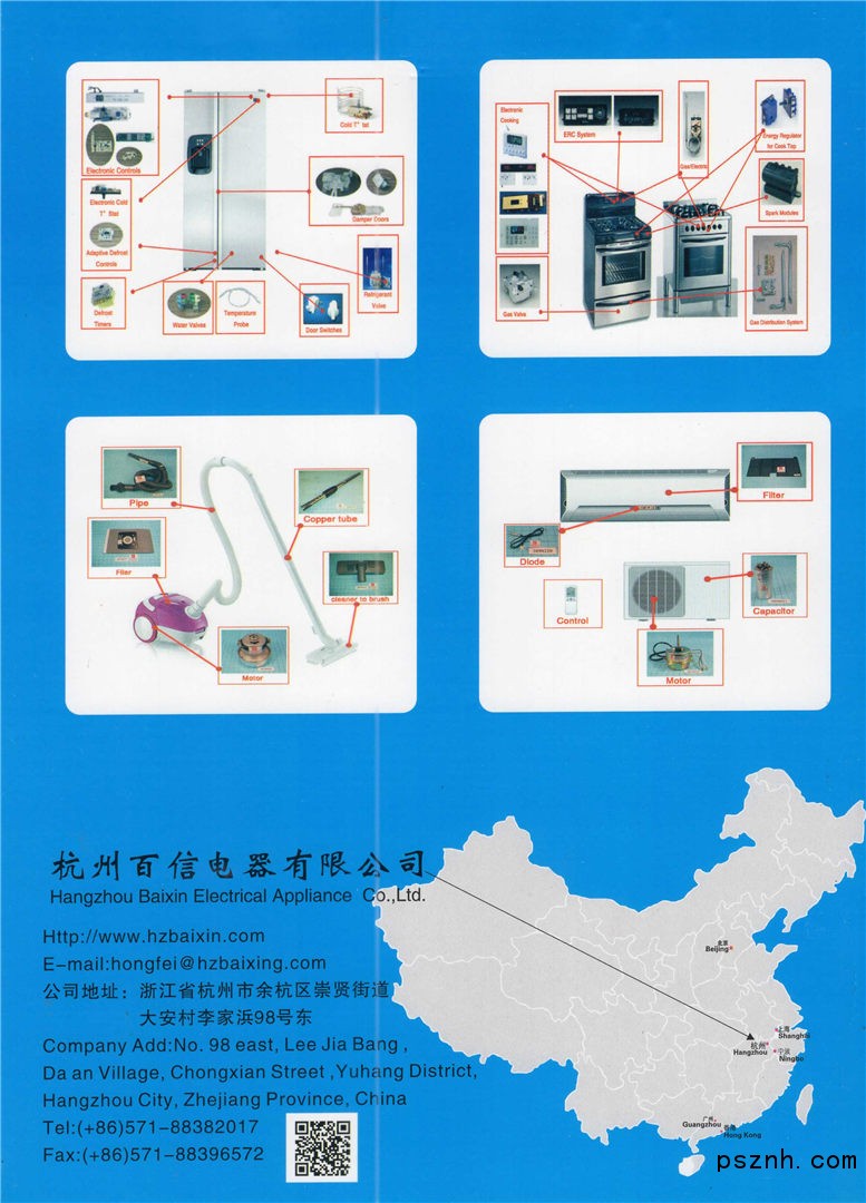 杭州百信電器有限公司自1990年開始銷售家用電器配件及來樣生產(chǎn)。包括:洗衣機(jī)、冰箱、空調(diào)、電視機(jī)、電飯鍋、微波爐、電風(fēng)扇、吸塵器、飲水機(jī)、果汁機(jī)等幾十個品種,幾千個規(guī)格。公司位于杭州市下城區(qū)永佳西苑105號后面百信倉庫。   公司以質(zhì)量第一,信譽(yù)至上,交貨及時、堅(jiān)持薄利多銷,讓利客戶為原則,以客戶滿意為宗旨。愿與四方客商共同合作,共創(chuàng)未來!