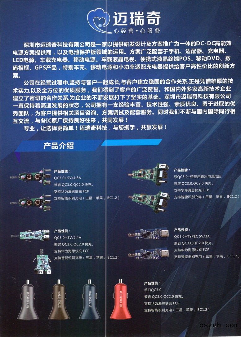 深圳市邁瑞奇科技有限公司是一家以提供研發(fā)設(shè)計,及方案推廣為一體的DC-DC高能效電源方案提供商以及電池保護板領(lǐng)域的運用,方案廣泛配套于手機、適配器、充電器、LED電源、車載充電器、移動電源、車載液晶電視、便攜式液晶終端POS、移動DVD、數(shù)碼相框、GPS產(chǎn)品,特別車充、移動電源和小功率適配充電器提供給客戶高性價比的創(chuàng)新方案。