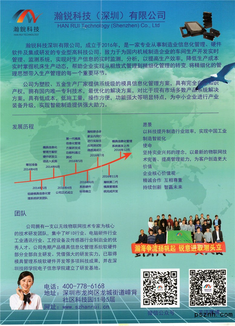 瀚銳科技(深圳)有限公司,是一家專業(yè)從事制造業(yè)信息化管理及相關(guān)硬件、軟件及集成研發(fā)的專業(yè)型高科技公司。公司主營業(yè)務(wù)為注塑車間生產(chǎn)整體方案優(yōu)化,致力于車間生產(chǎn)效率提高,節(jié)能降耗,為客戶最大限度降低生產(chǎn)運(yùn)營成本,實(shí)現(xiàn)綠色可持續(xù)發(fā)展,并向著智能制造方向逐步演進(jìn)!