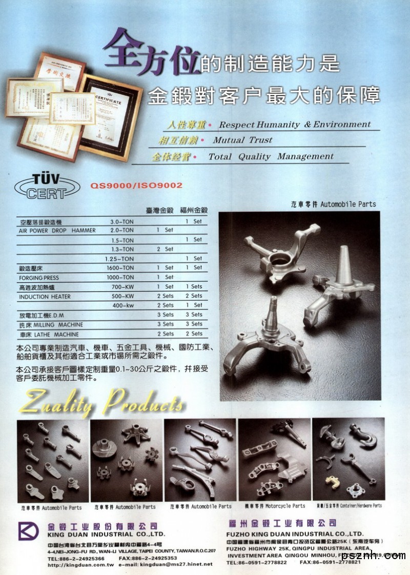 金鍛工業(yè)股份有限公司于1985年在臺灣成立,目前員工270人,產(chǎn)能1500T/月,產(chǎn)值1400萬美金/年。主要生產(chǎn)汽車、摩托車及各式機(jī)械五金熱鍛件,品質(zhì)通過QS-9000認(rèn)證。