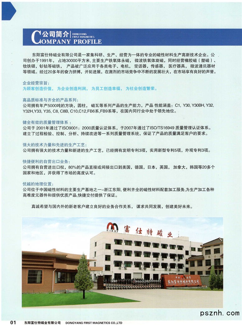 東陽(yáng)富仕特磁業(yè)有限公司是一家中外合資本企業(yè)。成立于1990年,現(xiàn)有員工300名;企業(yè)已于2001年通過(guò)國(guó)際質(zhì)量管理標(biāo)準(zhǔn)ISO9001:2000認(rèn)證,2007年3月底前通過(guò)了專(zhuān)用于汽車(chē)方面的質(zhì)量管理標(biāo)準(zhǔn)ISO/TS16949認(rèn)證,連續(xù)多年被評(píng)為東陽(yáng)市朝陽(yáng)企業(yè);連續(xù)多年成為東陽(yáng)市超百萬(wàn)納稅大戶(hù)。產(chǎn)品大部分出口,資信等級(jí)AAA級(jí)。 本公司主要生產(chǎn)出口磁鐵及磁性應(yīng)用品,工廠擁有國(guó)內(nèi)先進(jìn)設(shè)備、雄厚的技術(shù)力量、高精度的檢測(cè)儀器,生產(chǎn)的高性能永磁鐵氧體被廣泛應(yīng)用于家用電器、電機(jī)、汽車(chē)電子、自動(dòng)化儀表等領(lǐng)域。年生產(chǎn)能力達(dá)3000噸,90%產(chǎn)品出口10多個(gè)國(guó)家和地區(qū),并與歐美及日、韓等多家大公司建立了長(zhǎng)期穩(wěn)定的業(yè)務(wù)關(guān)系,公司產(chǎn)品已進(jìn)入NOKIA、西門(mén)子、松下、羅杰斯和法拉利等全球著名公司。 現(xiàn)為浙江省高新技術(shù)企業(yè),磁性材料省級(jí)高新技術(shù)特色基地成員,浙江省磁性材料產(chǎn)業(yè)協(xié)會(huì)高新技術(shù)研發(fā)基地。