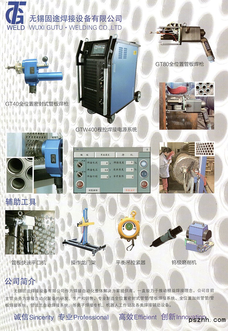 無錫固途焊接設(shè)備有限公司作為焊接自動(dòng)化整體解決方案提供商,一直致力于推動(dòng)精益焊接理念,公司目前主營業(yè)務(wù)為焊接自動(dòng)化裝備的研發(fā)、生產(chǎn)和銷售;同時(shí)為客戶提供焊接技術(shù)優(yōu)化、焊接現(xiàn)場問題處理、精益焊接制造的技術(shù)開發(fā)和咨詢,幫助客戶制定完善的解決方案,并同時(shí)提供工藝開發(fā)、設(shè)備升級(jí)改造、操作培訓(xùn)及耗材供應(yīng)等全套化解決方案,為客戶實(shí)現(xiàn)高效率、高質(zhì)量和低成本焊接,提供全方位的技術(shù)支持與服務(wù)。主營產(chǎn)品:專業(yè)制造管板、管管自動(dòng)焊機(jī)、等離子焊接專機(jī)、雙脈沖mig焊機(jī)、及各類焊接輔助設(shè)備經(jīng)營理念:可靠的質(zhì)量、及時(shí)的供貨、至上的服務(wù)