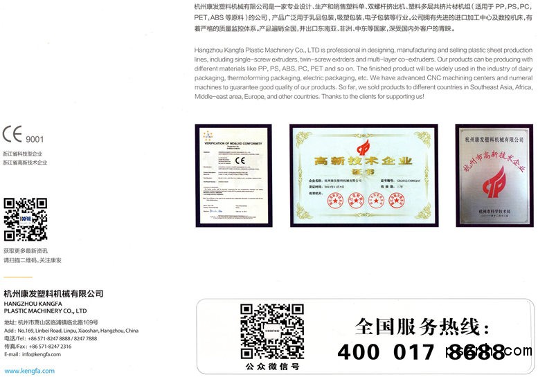 杭州康發(fā)塑料機(jī)械有限公司,是一家創(chuàng)建于70年代,有著三十多年機(jī)械經(jīng)驗(yàn)的公司,注冊(cè)資金為1050萬(wàn)。公司坐落于國(guó)際花園城市杭州市郊,水陸空交通便利的錢塘江南岸——蕭山臨浦工業(yè)園區(qū)。本公司是一家專業(yè)生產(chǎn)和銷售塑料單、雙螺桿擠出機(jī)、塑料多層共擠片材機(jī)組的專業(yè)公司(使用PP、PS、PC、PET、ABS等原料),產(chǎn)品廣泛用于乳品包裝,吸塑包裝,電子包裝等行業(yè)。公司占地面積30畝,擁有先進(jìn)的進(jìn)口加工中心及數(shù)控機(jī)床 ,有著嚴(yán)格的質(zhì)量監(jiān)控體系。專業(yè)工程師時(shí)刻在生產(chǎn)第一線,結(jié)合高科技手段利用機(jī)械三維軟件輔助設(shè)計(jì)對(duì)產(chǎn)品進(jìn)行實(shí)時(shí)監(jiān)督。