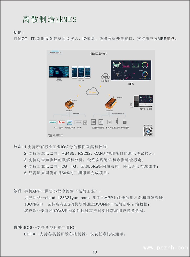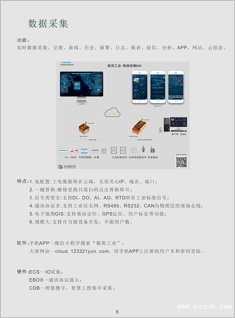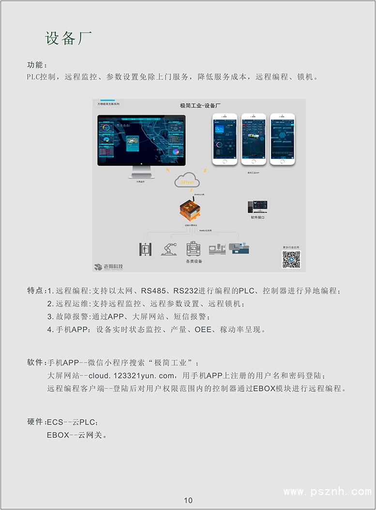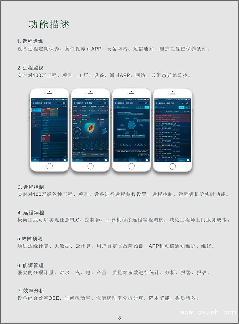 1、 手機APP-設(shè)備銀行微信小程序;手機端設(shè)備監(jiān)控、分析、智能推送、故障報警、日志、報表、工具化掃碼綁點建云、權(quán)限管理。