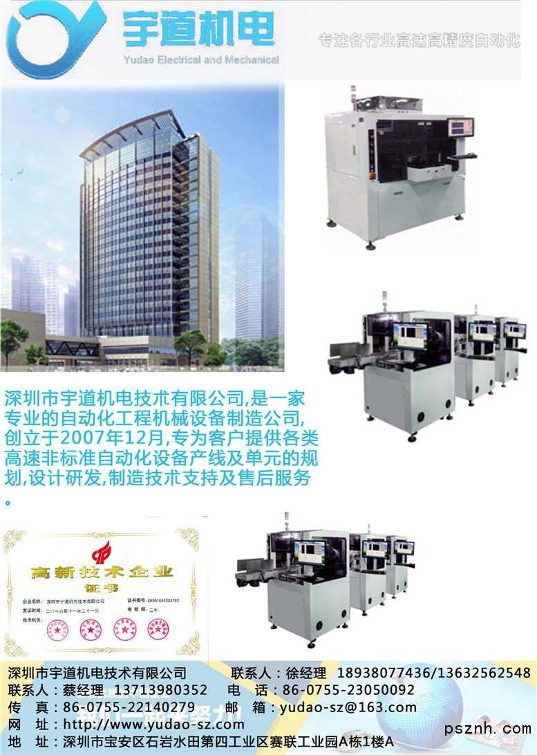深圳市宇道機電技朮有限公司,是一家專業(yè)的自動化工程機械設備制造公司,創(chuàng)立于2007年12月,專為客戶提供各類高速非標準自動化設備產線及單元的規(guī)劃,設計研發(fā),制造技朮支持及售后服務。