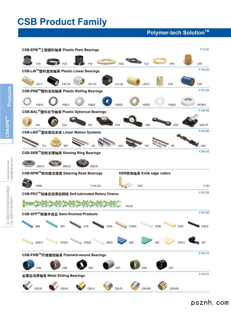 浙江長盛塑料軸承技術(shù)有限公司是中國專業(yè)的免維護自潤滑材料、軸承研究開發(fā)制造商。CSB憑借多年來對自潤滑材料科學(xué)的關(guān)注與研究開發(fā)出四大系列產(chǎn)品:金屬復(fù)合基滑動軸承、金屬基滑動軸承、塑料滑動軸承、纖維纏繞軸承。本網(wǎng)站詳細(xì)介紹的是CSB旗下分公司浙江長盛塑料軸承技術(shù)有限公司生產(chǎn)的工程塑料軸承、塑料直線軸承、塑料關(guān)節(jié)軸承、纖維纏繞軸承以及直線導(dǎo)軌模組的技術(shù)特性和應(yīng)用指南,CSB已發(fā)布的標(biāo)準(zhǔn)系列材料及其產(chǎn)品適用于大多數(shù)應(yīng)用場合,CSB也專注于客戶特殊材料的開發(fā)與應(yīng)用;高性能聚合物自潤滑改性技術(shù)的研究促使CSB在非金屬滑動軸承領(lǐng)域逐步成為市場的領(lǐng)跑者.