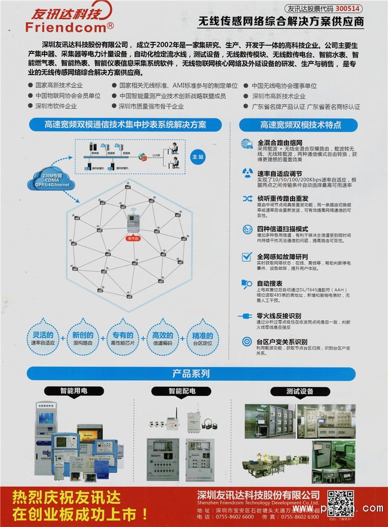 多年來,友訊達一直秉承“專業(yè)敬業(yè),創(chuàng)造卓越”的企業(yè)準(zhǔn)則,潛心于拓展無線電數(shù)傳領(lǐng)域,已成功推出了具有獨立知識產(chǎn)權(quán)、符合中國國情的FC系列無線數(shù)傳產(chǎn)品,其中FC-201、FC-221、FC-601、FC-621等系列民用無線控制裝置已通過國家無線電管理機構(gòu)的核準(zhǔn),并實現(xiàn)規(guī)模化生產(chǎn),年產(chǎn)量可達1000萬臺(套)。我公司按國網(wǎng)標(biāo)準(zhǔn)生產(chǎn)的集中器、I型及II型采集器等FC-621系列電力用戶用電信息采集設(shè)備已經(jīng)通過國網(wǎng)計量中心的委托全性能試驗,完全符合國家電網(wǎng)最新要求以及其他相關(guān)行業(yè)標(biāo)準(zhǔn)。