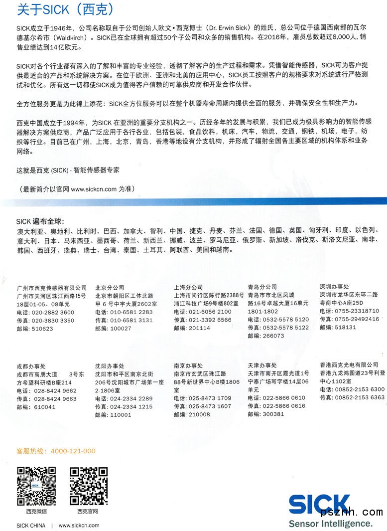 廣州市西克傳感器有限公司  SICK 成立于 1946 的企業(yè),擁有 50 多家子公司和股權(quán)投資公司以及眾多代理機(jī)構(gòu),足跡遍及世界各地。2017 財(cái)政年度,SICK 在全球擁有 9,000 多名員工,集團(tuán)年收入近 15 億歐元。