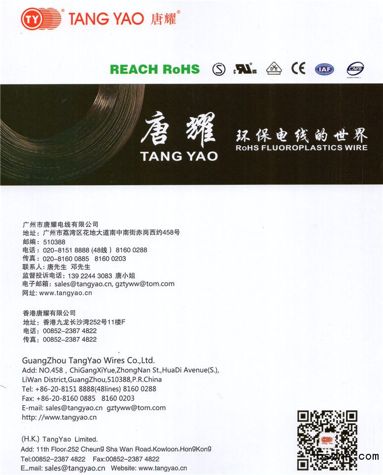 廣州市唐耀電線有限公司是環(huán)保認(rèn)證高溫電線、環(huán)保高溫電線、高溫電線、鐵氟龍電線、低煙無鹵電線、鐵氟龍?zhí)坠?、硅膠電線等產(chǎn)品專業(yè)生產(chǎn)加工的有限責(zé)任公司(自然人投資或控股),公司總部設(shè)在廣州市 荔灣區(qū) 花地大道南 中南街 赤4,廣州市唐耀電線有限公司擁有完整、科學(xué)的質(zhì)量管理體系。廣州市唐耀電線有限公司的誠信、實(shí)力和產(chǎn)品質(zhì)量獲得業(yè)界的認(rèn)可。歡迎各界朋友蒞臨廣州市唐耀電線有限公司參觀、指導(dǎo)和業(yè)務(wù)洽談。