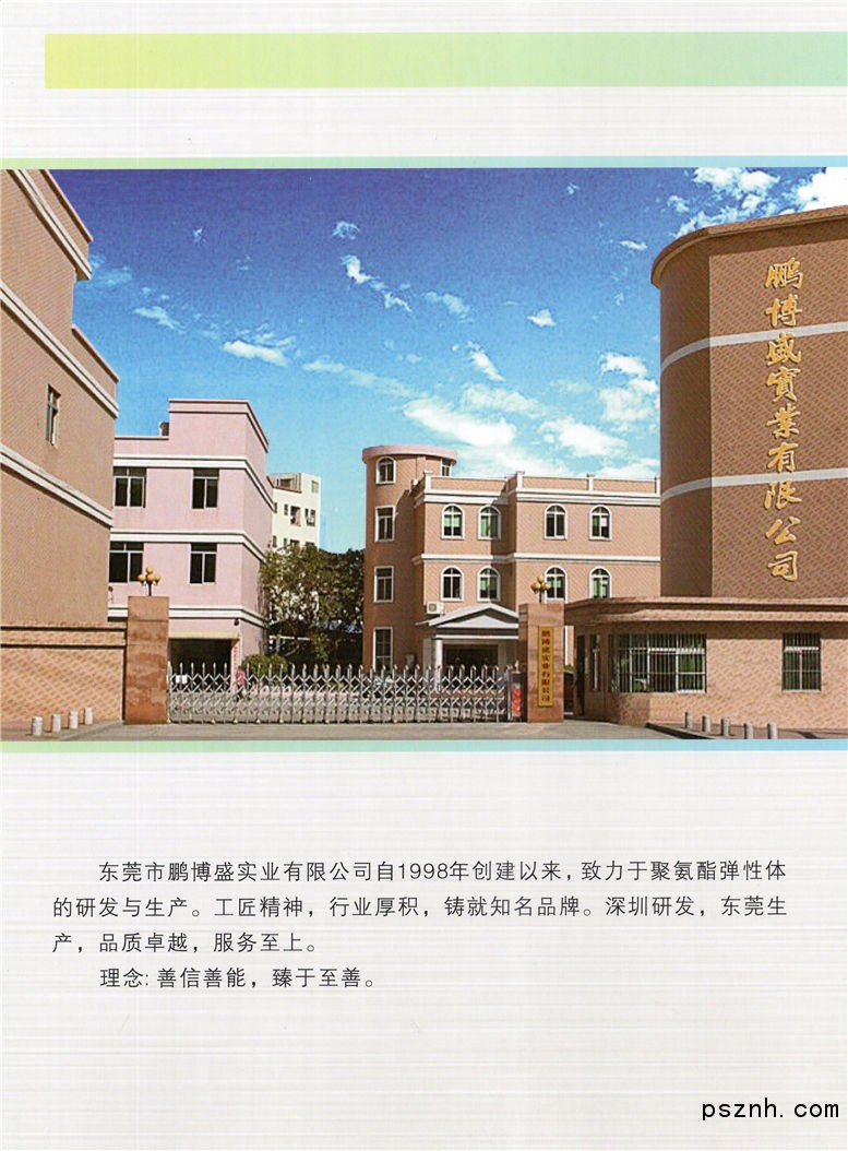 東莞市鵬博盛實業(yè)有限公司創(chuàng)立于1998年,專注研發(fā)聚氨酯高分子新材料,集生產(chǎn)、質(zhì)控、營銷一體化,被評定為國家高新技術企業(yè),生產(chǎn)研發(fā)基地位于東莞市。 致力于聚氨酯彈性體、橡膠、機電配套產(chǎn)品和不飽和樹脂等產(chǎn)品的研發(fā)和生產(chǎn),綜合實力雄厚,“鵬博盛(PEPSON)”品牌己成為業(yè)界的知名品牌,享有盛譽。