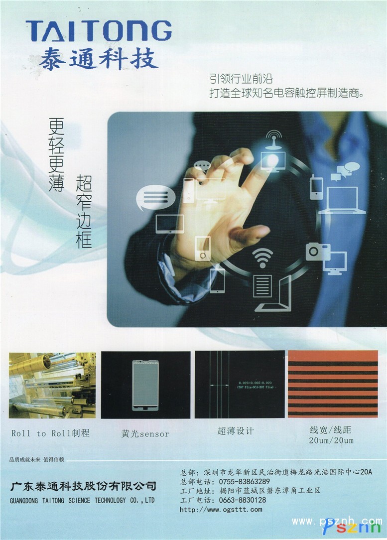 廣東泰通科技股份有限公司是專業(yè)從事電容觸摸屏(Touch Panel/Window)研發(fā)、制造、銷售于一體的高科技企業(yè)。公司于2012年10月8日成立,位于廣東省揭陽(yáng)市經(jīng)濟(jì)技術(shù)開發(fā)區(qū),注冊(cè)資本6000萬(wàn)元,總投資額3億元,占地面積150畝;主營(yíng)產(chǎn)品為膜(Film)結(jié)構(gòu)投射式電容觸控屏(CTP)及模組,年產(chǎn)能3600萬(wàn)片。產(chǎn)品廣泛應(yīng)用于手機(jī)(Mobile)、衛(wèi)星導(dǎo)航系統(tǒng)(GPS)、汽車電子、數(shù)位相機(jī)等中小尺寸可攜式電子產(chǎn)品用ITO觸控面板(Touch Panel/Window),以及筆記本電腦(Note Book)、工業(yè)控制產(chǎn)品、家用電器等大尺寸電子產(chǎn)品觸控面板領(lǐng)域。 公司擁有標(biāo)準(zhǔn)的百級(jí)無(wú)塵生產(chǎn)車間(符合Fed-std-209E潔凈室標(biāo)準(zhǔn)),并從臺(tái)灣、日本和法國(guó)等地引進(jìn)國(guó)際先進(jìn)的現(xiàn)代化的全自動(dòng)生產(chǎn)設(shè)備,立足高起點(diǎn),采用了代表觸摸屏行業(yè)未來(lái)發(fā)展趨勢(shì)的卷對(duì)卷(Roll to Roll)的黃光制程工藝,可實(shí)現(xiàn)超窄邊框、更高精度和更高良率的產(chǎn)品生產(chǎn),為廣大客戶提供更好的服務(wù)。