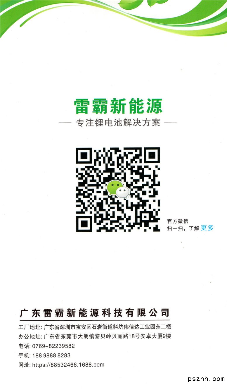 廣東雷覇新能源科技有限公司,本公司成立于2016年,注冊資本1100萬,主要研發(fā)、生產(chǎn)、銷售各類鋰電池及鋰電池組。作為一家迅速發(fā)展的高科技公司,我們秉持精誠合作的企業(yè)精神,倡導簡單和諧的人際關(guān)系;在研發(fā)上,我們始終堅持嚴謹、創(chuàng)新的科學態(tài)度;生產(chǎn)中,在使用現(xiàn)代化設(shè)備的同時,通過準軍事化的管理,生產(chǎn)出質(zhì)量合格的產(chǎn)品;在經(jīng)營上,我們以服務(wù)共贏作為企業(yè)的經(jīng)營理念;在售前,我們認真細致聽取客戶需求,為客戶選擇合適的產(chǎn)品, 提供適合的解決方案;在售后,我們耐心解答客戶問題,及時、準確接收客戶的反饋信息,改進我們的產(chǎn)品和服務(wù),讓我們的客戶在激烈的市場競爭中處于有利位置,并搶占商機。愿與廣大朋友攜手共創(chuàng)美好的明天!合作共贏!精誠鑄就品牌,悉心創(chuàng)造輝煌!聯(lián)系電話:18898888283  0769-82839582
