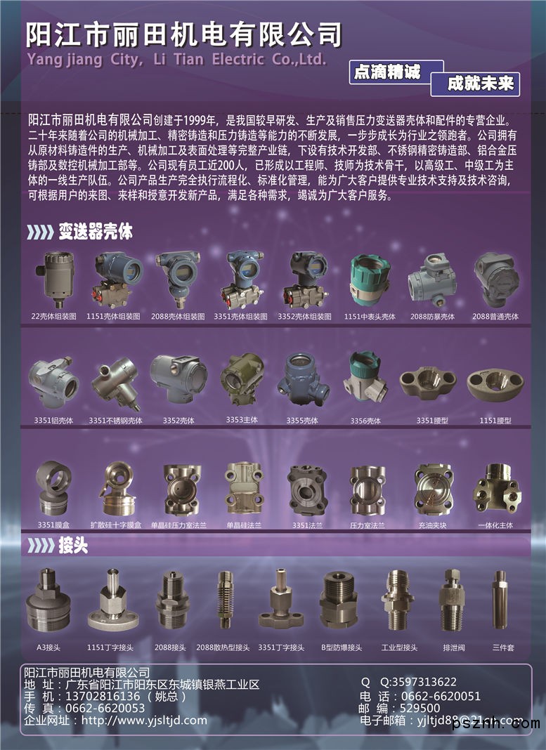 陽江市麗田機(jī)電有限公司 創(chuàng)建于1999年,是我國較早研發(fā)、生產(chǎn)及銷售壓力變送器殼體和配件的專營企業(yè)。二十年來隨著公司的機(jī)械加工、精密鑄造和壓力鑄造等能力的不斷發(fā)展,一步步成長為行業(yè)之領(lǐng)跑者。公司擁有從原材料鑄造件的生產(chǎn)、機(jī)械加工及表面處理等完整產(chǎn)業(yè)鏈,下設(shè)有技術(shù)開發(fā)部、不銹鋼精密鑄造部、鋁合金壓鑄部及數(shù)控機(jī)械加工部等。公司現(xiàn)有員工近200人,已形成以工程師、技師為技術(shù)骨干,以高級(jí)工、中級(jí)工為主體的一線生產(chǎn)隊(duì)伍。公司產(chǎn)品生產(chǎn)完全執(zhí)行流程化、標(biāo)準(zhǔn)化管理,能為廣大客戶提供專業(yè)技術(shù)支持及技術(shù)咨詢,可根據(jù)用戶的來圖、來樣和授意開發(fā)新產(chǎn)品,滿足各種需求,竭誠為廣大客戶服務(wù)。