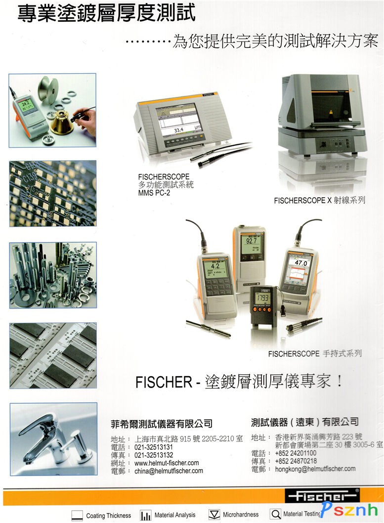 FISCHER 公司生產(chǎn)的各類儀器,廣泛應用于航天工業(yè)、航空工業(yè)、造船工業(yè)、港口機械、電鍍工業(yè)、顯像管流水線、電子工業(yè)(包括印制電路行業(yè)、半導體工業(yè))、汽車工業(yè)、石油化工、黃金珠寶、手表、大專院校、科研單位、第三方測試機構等眾多行業(yè)。