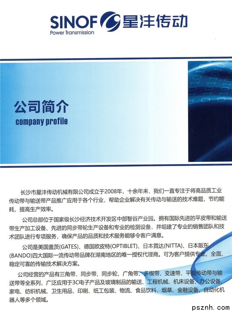 長(zhǎng)沙市星灃傳動(dòng)機(jī)械有限公司(原長(zhǎng)沙市星豐工業(yè)皮帶有限公司)自2005年始一直專(zhuān)注于工業(yè)傳動(dòng)帶與輸送帶的研究與服務(wù)事業(yè)。公司經(jīng)營(yíng)品牌為“SINOF”(司諾豐),專(zhuān)業(yè)生產(chǎn)優(yōu)質(zhì)同步帶和輕型輸送帶的加工。 星灃公司是湖南省內(nèi)目前具規(guī)模、專(zhuān)業(yè)的從事傳動(dòng)帶和輕型輸送帶的研究和加工的生產(chǎn)型企業(yè)。擁有先進(jìn)的輸送帶加工設(shè)備和檢測(cè)設(shè)備,完善的質(zhì)量控制體系以及專(zhuān)業(yè)的銷(xiāo)售團(tuán)隊(duì)和技術(shù)團(tuán)隊(duì)進(jìn)行專(zhuān)項(xiàng)服務(wù)。確保產(chǎn)品質(zhì)量和服務(wù)質(zhì)量讓廣大客戶(hù)滿(mǎn)意。 星灃公司的產(chǎn)品材質(zhì)從橡膠,聚氨酯(PU),人工合成皮革,聚氯乙烯(PVC),聚乙烯(PE)、聚酯Hytrel、硅膠Silicon等全列,一站式采購(gòu),并可提供傳動(dòng)帶的二次加工服務(wù),如加耐磨(紅綠白黑)膠、PU膠、打孔、開(kāi)槽、海綿、花紋、裙邊、擋板、導(dǎo)向條、轉(zhuǎn)彎?rùn)C(jī)等,并可免費(fèi)為客戶(hù)提供帶與帶輪的匹配與設(shè)計(jì)選型和配套供應(yīng)服務(wù)。產(chǎn)品廣泛應(yīng)用于紡織、印染、機(jī)場(chǎng)物流、煙草、運(yùn)動(dòng)、木工、食品、汽車(chē)制造、陶瓷、鋼鐵、石材加工、造紙印刷等行業(yè)。 星灃傳動(dòng)公司也是日本三星(MITSUBOSHI)和美國(guó)蓋茨(GATES)兩大國(guó)際品牌傳動(dòng)帶的湖南特約經(jīng)銷(xiāo)商,常備庫(kù)存量大、交貨期短、并以?xún)?yōu)質(zhì)、專(zhuān)業(yè)的服務(wù)贏得客戶(hù)的一致好評(píng)。 隨著國(guó)內(nèi)經(jīng)濟(jì)發(fā)展快速增長(zhǎng),本公司也正處在飛速發(fā)展的進(jìn)程中,生產(chǎn)規(guī)模日益壯大。我們將立足長(zhǎng)沙,輻射湖南,放眼全中國(guó)。一如既往的為客戶(hù)提供優(yōu)質(zhì)、全面的業(yè)務(wù)服務(wù)!