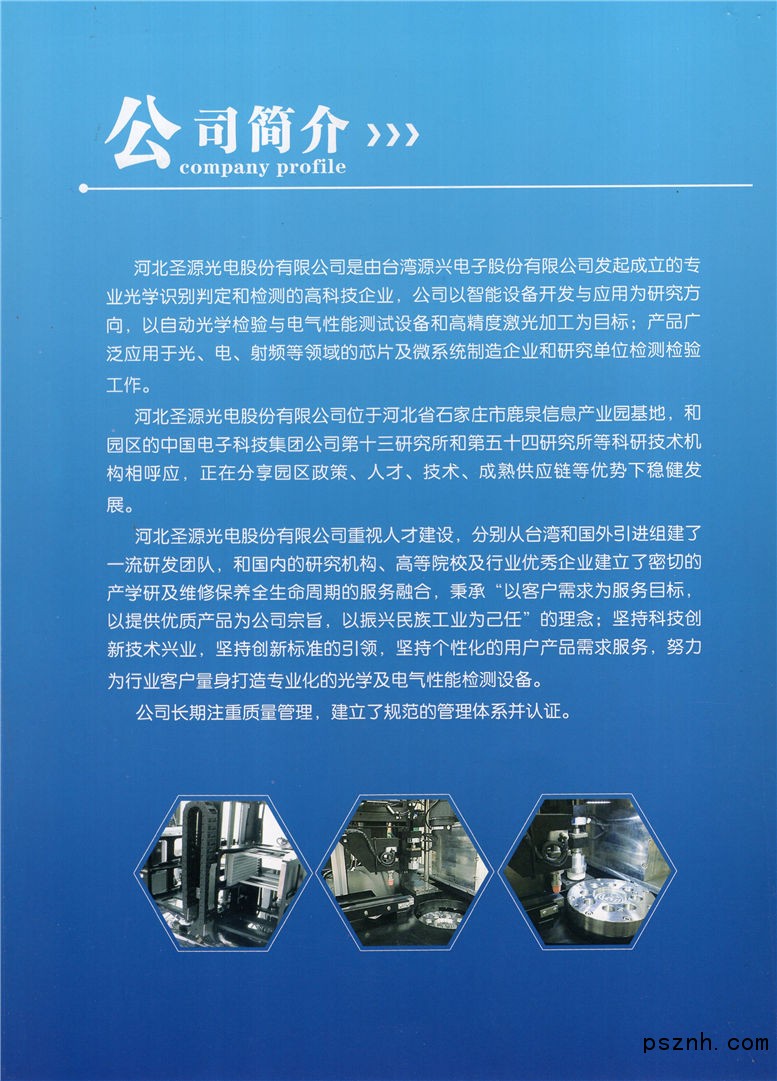 河北圣源光電股份有限公司主產(chǎn)品有金屬探測器,金屬探測儀,金屬檢測機,金屬檢測儀,檢針機,金屬分離器,X射線異物檢測機,X射線安檢機,重量選別機,重量分級機等設備,公司位于交通便利、京津冀一體化的河北省石家莊市,是一家由臺灣源興電子股份有限公司發(fā)起成立的專業(yè)光學識別判定的高科技企業(yè)。近期公司和園區(qū)的中國電子科技集團公司第十三研究所和第五十四研究所等科研技術機構(gòu)相呼應,共同利用園區(qū)極為方便的人才技術、產(chǎn)業(yè)政策和高度成熟的供應鏈已研制出一系列適合各類客戶需求的檢測設備,為眾多客戶提供了各種完善的解決方案和大量的產(chǎn)品和服務,擁有極為廣泛的客戶群體,產(chǎn)品直接銷售到全國各地,并取得了一定的成績,在同行業(yè)中享有很高的知名度。