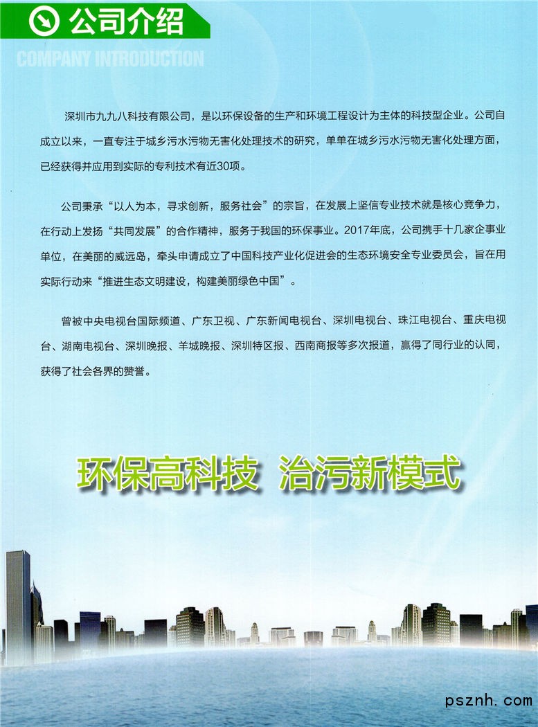深圳九九八系列產(chǎn)品、獲國家知名品牌重、著名品牌、AAA級資信企業(yè)等。在各類水處理方面,達(dá)國內(nèi)先進(jìn)水平,部分技術(shù)領(lǐng)先世界,公司自主研發(fā)設(shè)計(jì)制造的MT系列污水快速處理裝置能夠快速出清水,水質(zhì)穩(wěn)定,符合相應(yīng)國家污水排放標(biāo)準(zhǔn)公司擁有自己的環(huán)境工程設(shè)計(jì)研究機(jī)構(gòu),內(nèi)設(shè)先進(jìn)的水樣分析室;還擁有完整的環(huán)保成套設(shè)備生產(chǎn)線