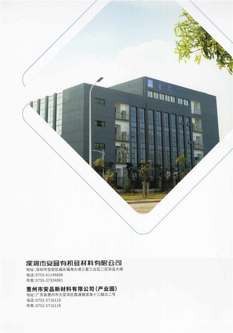 深圳市安品有機硅材料有限公司是一家致力于高分子新材料研究開發(fā)、生產(chǎn)及經(jīng)營的國家級高新技術(shù)企業(yè),在有機硅、聚氨脂、丙烯酸樹脂以及相關(guān)樹脂的改性等復合材料領(lǐng)域里成果卓越,同時在有機硅膠粘劑、有機硅功能橡膠、導熱導電及水性乳液的研究和生產(chǎn)處于行業(yè)的領(lǐng)先水平。深圳市安品有機硅材料有限公司也是深圳市新材料協(xié)會、深圳市高分子行業(yè)協(xié)會、中國膠粘劑等行業(yè)協(xié)會的副會長和理事單位。
