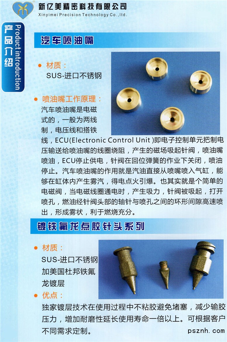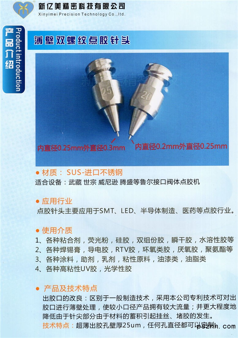 深圳市新億美精密科技有限公司是一家集研發(fā)、生產(chǎn)、銷售于一體的高科技企業(yè)。我司專注于超高精密不銹鋼零件設(shè)計(jì)、制造;并可根據(jù)用戶樣品或圖紙?zhí)峁┊a(chǎn)品,根據(jù)客戶需求定制各種高精度非標(biāo)配件。 產(chǎn)品廣泛應(yīng)用于電子行業(yè),并提高生產(chǎn)效率和生產(chǎn)質(zhì)量,同時(shí)可以降低企業(yè)的生產(chǎn)成本等,因此深得業(yè)內(nèi)人士的信賴,并獲得業(yè)內(nèi)人士的高度評(píng)價(jià)。 點(diǎn)膠針頭的精度也隨著各種點(diǎn)膠工藝的發(fā)展,對(duì)點(diǎn)膠效果產(chǎn)生很大的影響,點(diǎn)膠針頭的要求也越來越高,精度不但由點(diǎn)膠閥決定,對(duì)點(diǎn)膠針頭的要求更加高,高精度的點(diǎn)膠針頭就發(fā)揮著更大的左右,特別是應(yīng)用于LED,光通訊等微量點(diǎn)膠行業(yè)。