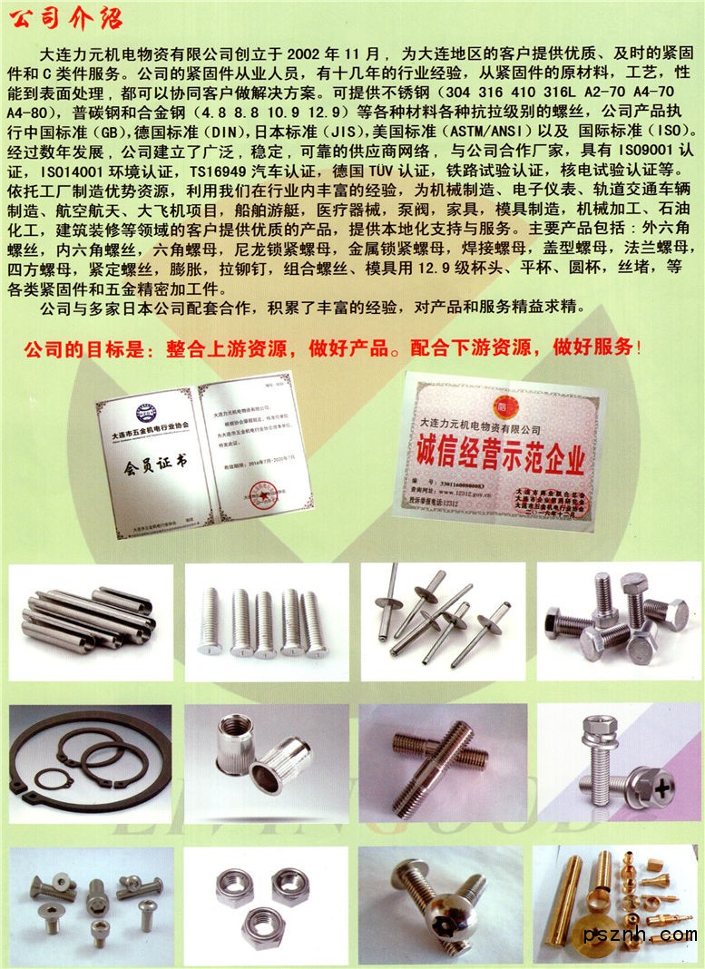 大連力元機電物資有限公司創(chuàng)立于2002年11月, 為大連地區(qū)的客戶提供優(yōu)質(zhì)、及時的緊固件和C類件服務(wù)。公司有超過10年以上經(jīng)驗的專業(yè)緊固件從業(yè)人員,從緊固件的原材料,工藝,性能到表面處理,都可以協(xié)同客戶做解決方案??商峁┎讳P鋼(304 316 410 316L A2-70 A4-70 A4-80),4.8級至12.9級等各種材料各種抗拉級別的螺絲,公司常備庫存執(zhí)行中國標準(GB),德國標準(DIN),日本標準(JIS),美國標準(ASTM/ANSI)以及 國際標準(ISO)。經(jīng)過數(shù)年發(fā)展,公司建立了廣泛,穩(wěn)定,可靠的供應(yīng)商網(wǎng)絡(luò), 公司的合作伙伴廠家,具有ISO9001認證, ISO14001環(huán)境認證, TS16949汽車認證,德國TUV認證,鐵路試驗認證,核電試驗認證等。 依托工廠制造優(yōu)勢資源,利用我們在行業(yè)內(nèi)豐富的經(jīng)驗,為區(qū)域內(nèi)電子、精密機械制造、汽車、軌道交通車輛制造、設(shè)備維修、電氣安裝、船舶游艇制造,醫(yī)療器械,泵閥,家具, 機車汽車,電器制造,模具制造,機械加工、石油化工,建筑裝修等領(lǐng)域的客戶提供優(yōu)質(zhì)的產(chǎn)品,本地化支持與服務(wù)。主要產(chǎn)品包括:外六角螺絲,內(nèi)六角螺絲,六角螺母, 尼龍鎖緊螺母,金屬鎖緊螺母,焊接螺母,蓋型螺母,法蘭螺母,四方螺母,長 螺母,緊定螺絲,平杯圓杯,塞打,膨脹,拉鉚釘,組合螺絲等。