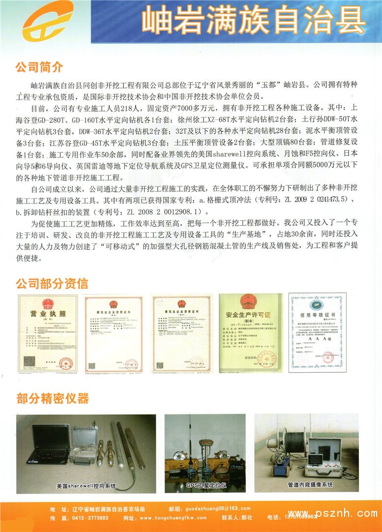 岫巖滿族自治縣同創(chuàng)非開挖工程有限公司總部位于遼寧省風(fēng)景秀麗的“玉都”岫巖縣。公司擁有特種工程專業(yè)承包資質(zhì),是國際非開挖技術(shù)協(xié)會和中國非開挖技術(shù)協(xié)會單位會員。