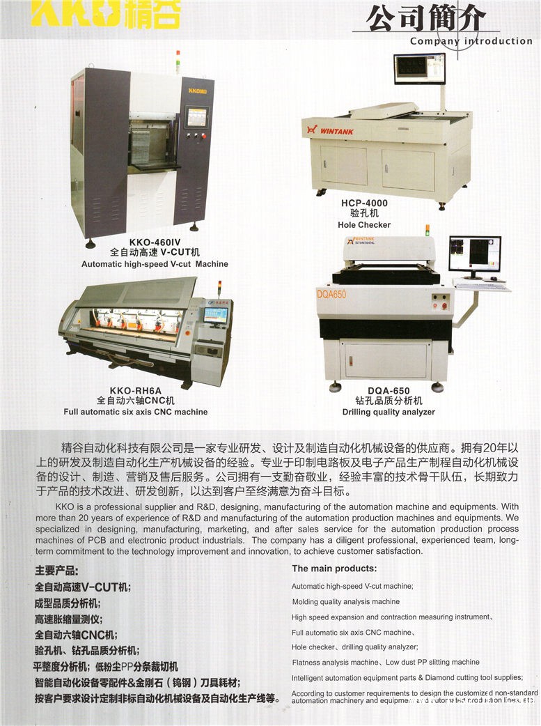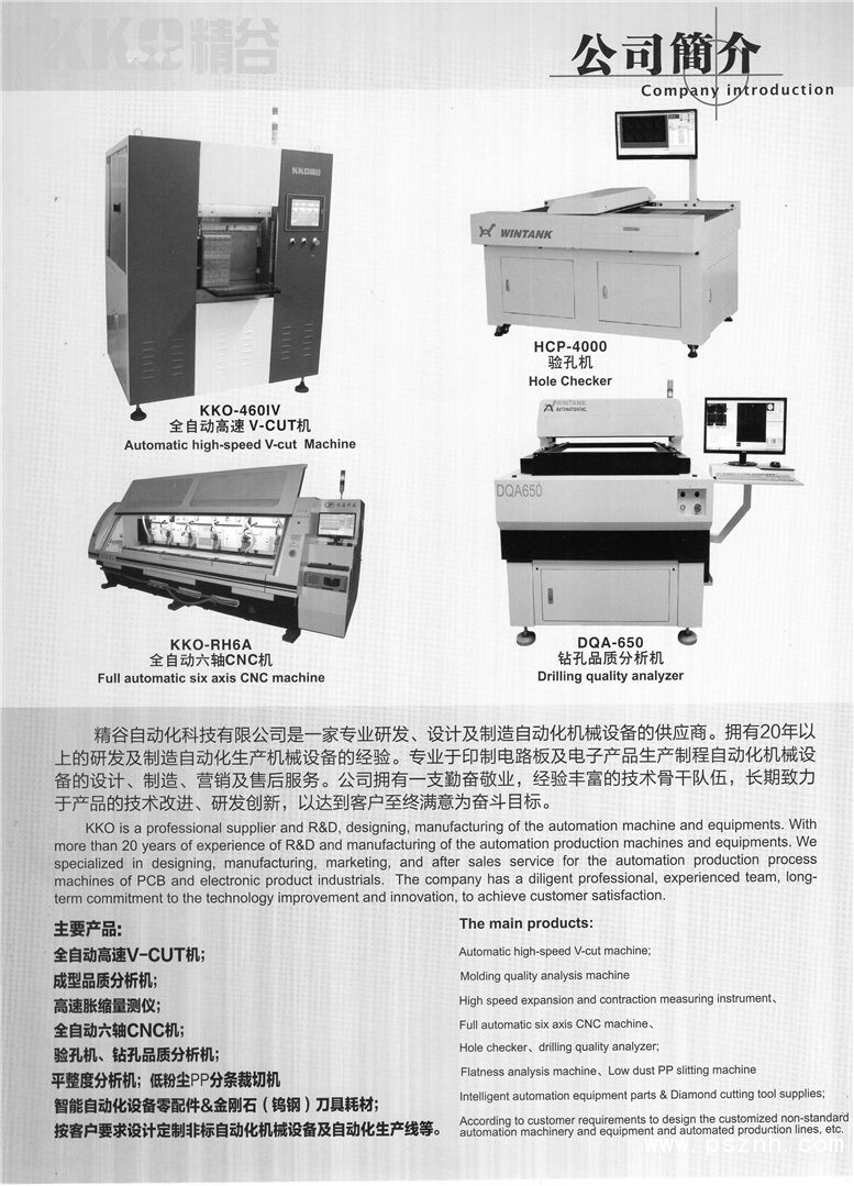 公司產(chǎn)品主要應(yīng)用服務(wù)于電子產(chǎn)品生產(chǎn)制程機械設(shè)備的智能自動化以及印制電路板的雙面多層,高端高精密線路(HDI),IC載板,以及鋁基板,鐵氟龍板及陶瓷板等特殊板的生產(chǎn)制作及檢測。 主要產(chǎn)品有:全自動高速V-CUT機、驗孔機、鉆孔品質(zhì)分析機、高速脹縮量測儀、自動板彎板翹量測機、全自動六軸CNC機、自動八軸沖孔機、雙軸X-RAY鉆靶機、2D X-RAY量測機、全自動八軸鉚釘機、自動三軸鉚釘機、多功能殘厚儀、智能自動化設(shè)備零配件&金剛石(鎢鋼)刀具耗材、按客戶要求設(shè)計定制非標(biāo)自動化機械設(shè)備及自動化生產(chǎn)線等。