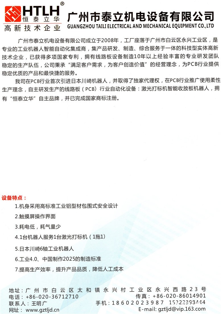 廣州市泰立機(jī)電設(shè)備有限公司成立于2008年,工廠座落于廣州市白云區(qū)夏良工業(yè)區(qū),是一家專業(yè)的工業(yè)機(jī)器人智能自動化集成商,集產(chǎn)品研發(fā)、制造、綜合服務(wù)于一體的科技型實(shí)體高新技術(shù)企業(yè),擁有線路板設(shè)備制造10年以上、經(jīng)驗(yàn)豐富的專業(yè)研發(fā)團(tuán)隊(duì),穩(wěn)定的生產(chǎn)隊(duì)伍,公司秉承“滿足客戶需求,為客戶創(chuàng)造價(jià)值”的經(jīng)營理念,為PCB行業(yè)提供穩(wěn)定優(yōu)質(zhì)的產(chǎn)品和最快捷的服務(wù)。