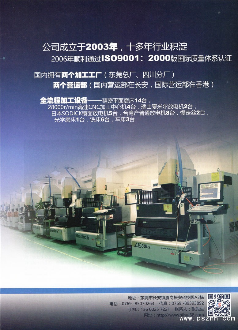 公司擁有廣大的生產(chǎn)制造能力。在國內擁有三個加工工廠(東莞總廠、上海分廠四川分廠),兩個營運部(國內營運部在長安,國際營運部在香港),擁有世界一流的加工設備,日本精密平面磨床14臺,28000r/min高速CNC加工中心機4臺,瑞士夏米爾放電機4臺,日本SODICK鏡面放電機5臺,臺灣產(chǎn)普通放電機12臺,CNSC加工中心6臺,慢走絲4臺,光學磨床2臺,銑床6臺,車床3臺,各加工工廠和各部門通過優(yōu)化組合,模具設計與制造和精密模具零件加工三大生產(chǎn)體系,以產(chǎn)品為龍頭帶動塑膠模具的開發(fā)設計,制造以及售后維護等。產(chǎn)品主要銷往日本、歐美和中國大陸等地,因精度高、質量好、納期短等特點、已贏得了國內外廣大客戶的贊譽和信任。
