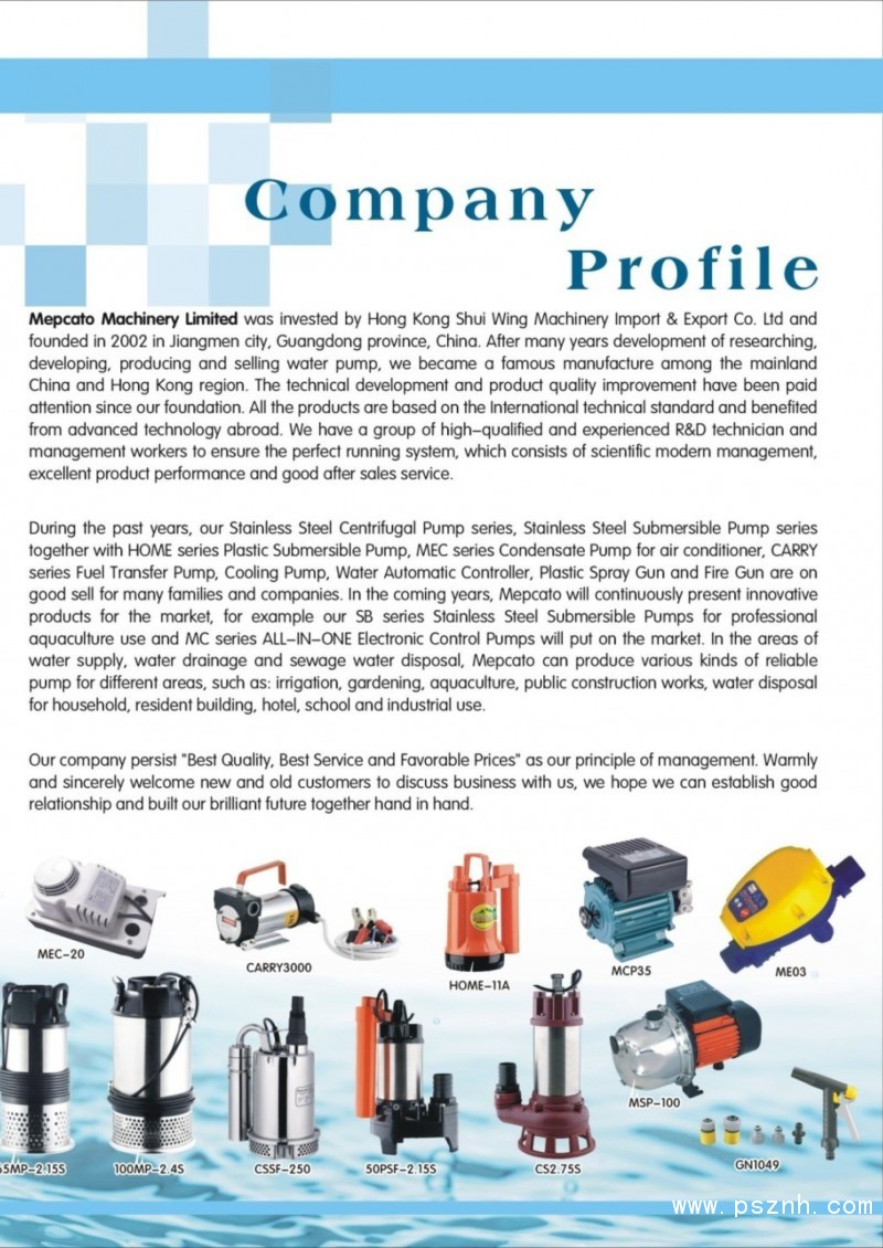 幾年來,本公司生產(chǎn)的MSP、SSP系列不銹鋼地面泵,CSS(F)、FSS(F)、50PS、CS2.75不銹鋼潛水泵、HOME系列經(jīng)濟型塑膠潛水泵,MP系列專業(yè)養(yǎng)魚泵,MEC系列空調(diào)排水泵,CARRY系列汽車油泵,冷卻泵,還有ME03型水流控制開關(guān)、GN1049型自動加壓清洗槍、M-352噴火槍等產(chǎn)品深受千家萬戶和企業(yè)的歡迎。在未來的日子裏,麥加道會因應(yīng)市場需求繼續(xù)開發(fā)實用新穎的新產(chǎn)品,例如我們Vinflo液壓控制器和CS2.4系列排水泵于2012年2月正式推向市場,HOME-10超低水位潛水泵于11月全面發(fā)售。在供水,排水和污水領(lǐng)域,麥加道生產(chǎn)的可靠性高的多種泵型可廣泛應(yīng)用於諸如灌溉、園藝、養(yǎng)殖業(yè),水產(chǎn)業(yè)、市政工程、生活及工業(yè)供水、汙水處理等方面。