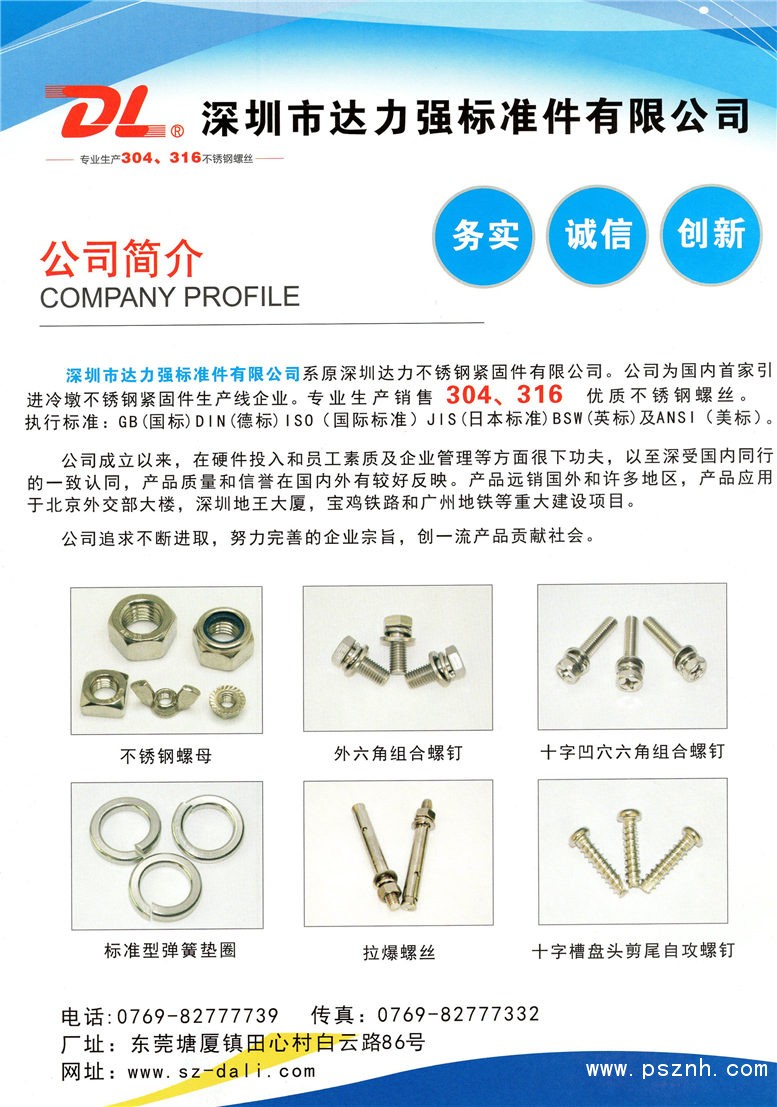 深圳市達力強標準件有限公司系原深圳達力不銹鋼緊固件有限公司。公司為國內首家引進冷墩不銹鋼緊固件生產線企業(yè)。采用日本和韓國原材料304HC’’302HQ和316優(yōu)質不銹鋼材質。執(zhí)行標準:GB(國標)DIN(德標)ISO(國際標準)JIS(日本標準)BSW(英標)及ANSI(美標)。 公司成立以來,在硬件投入和員工素質及企業(yè)管理等方面很下功夫,以至深受國內同行的一致認同,產品質量和信譽在國內外有較好反映。產品遠銷國外和許多地區(qū),產品應用于北京外交部大樓,深圳地王大廈,寶雞鐵路和廣州地鐵等重大建設項目。 公司追求不斷進取,努力完善的企業(yè)宗旨,創(chuàng)一流產品貢獻社會。本公司占地面積達3000平米,擁有各種先進企業(yè)生產設備,辦公設備齊全,凈資產3000萬