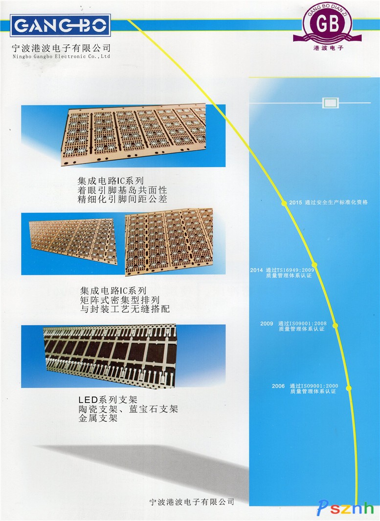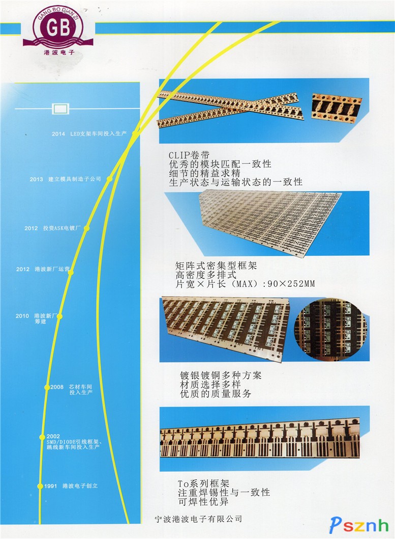 寧波港波電子有限公司創(chuàng)辦于1991年,是一家專業(yè)生產(chǎn)各種半導(dǎo)體分立器件塑封引線框架、精密塑料件及汽車門窗密封條鋼芯件的企業(yè)。本廠坐落于風(fēng)景秀麗的寧波東錢湖旅游度假區(qū)內(nèi),占地5500平方,依托優(yōu)越的地理位置和區(qū)域政策,加上自身的奮發(fā)開拓精神,建廠十多年來,生產(chǎn)規(guī)模和研發(fā)能力取得了長足發(fā)展,年加工生產(chǎn)能力達2220KK套,并通過了工SO9001-2000質(zhì)量認(rèn)證。