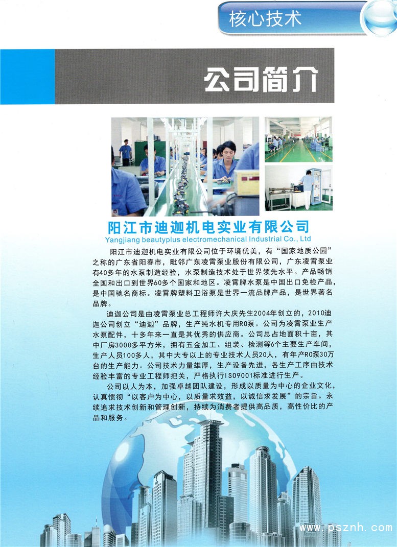 陽江市迪迦機(jī)電實(shí)業(yè)有限公司位于環(huán)境優(yōu)美,有“國家地質(zhì)公園”之稱的廣東省陽春市,毗鄰廣東凌霄泵業(yè)股份有限公司,廣東凌霄泵業(yè)是一家有40多年水泵制造經(jīng)驗(yàn),水泵制造技術(shù)處于世界領(lǐng)先水平。產(chǎn)品暢銷全國和出口到世界60多個(gè)國家和地區(qū)。凌霄牌水泵是中國出口免檢產(chǎn)品,是中國馳名商標(biāo)。凌霄牌塑料衛(wèi)浴泵是世界一流品牌產(chǎn)品,是世界著名品牌。